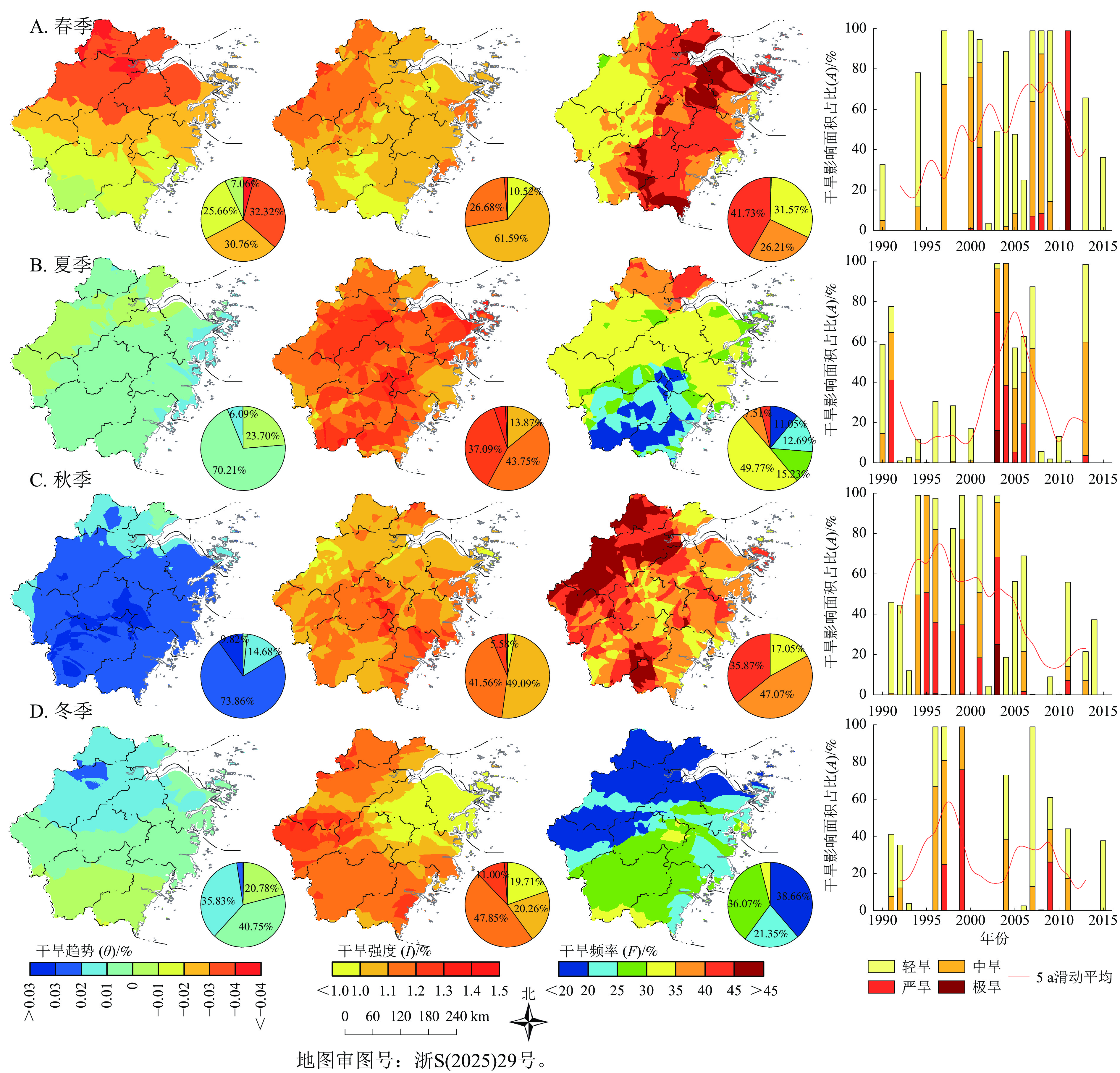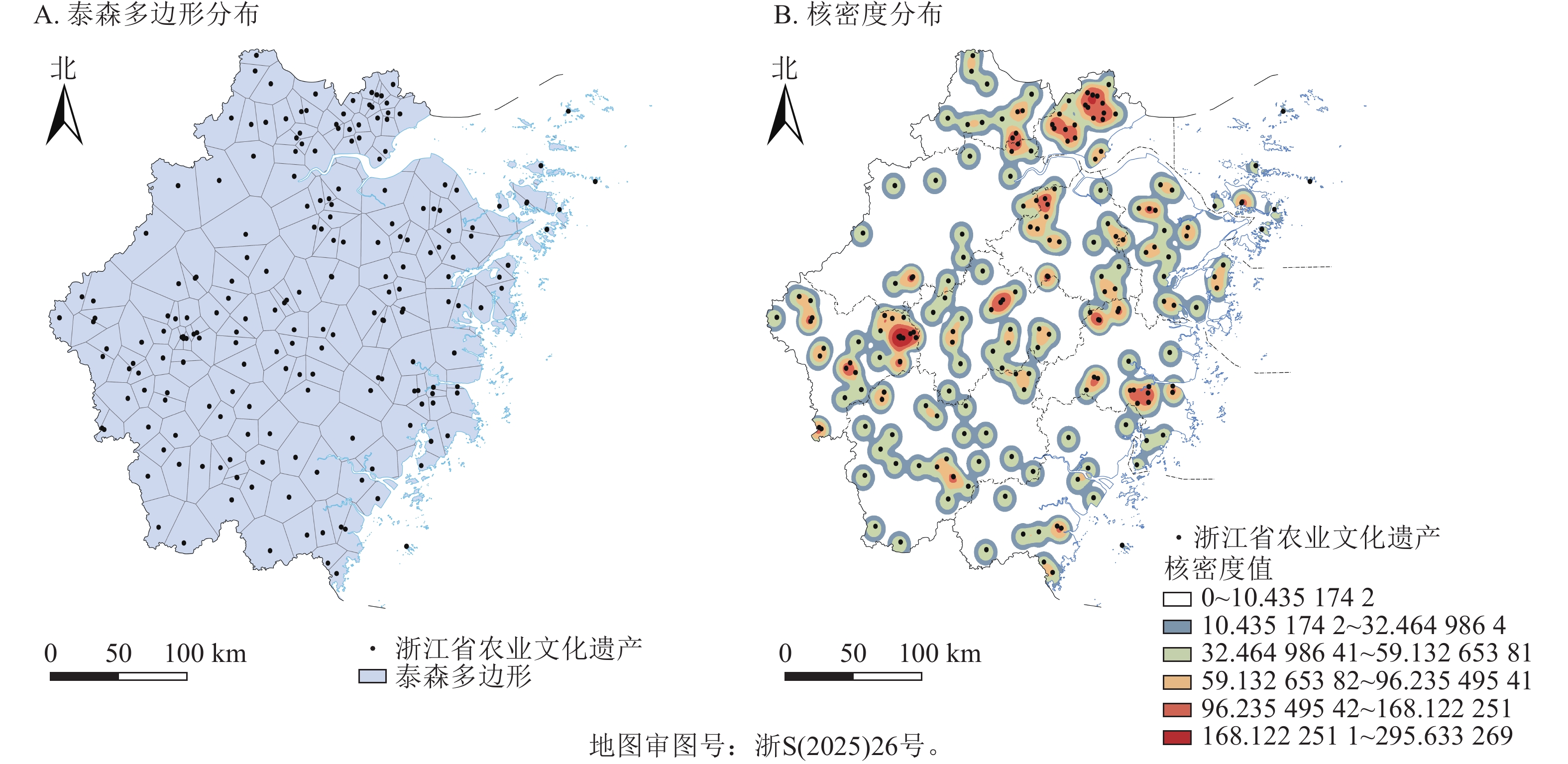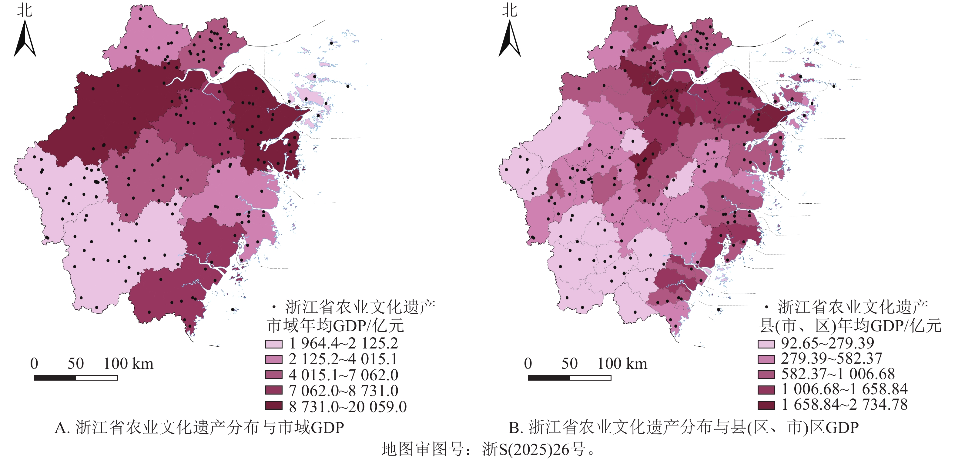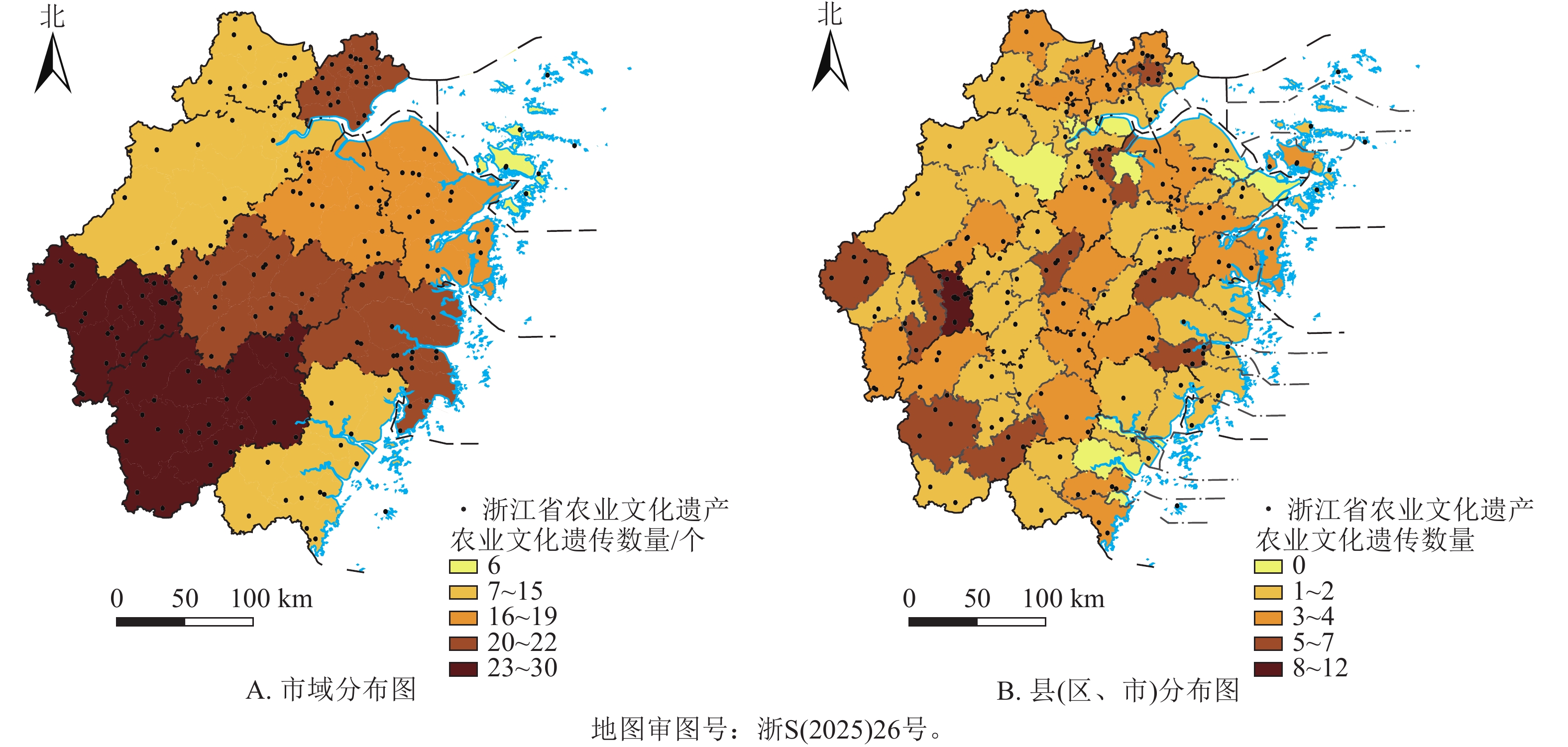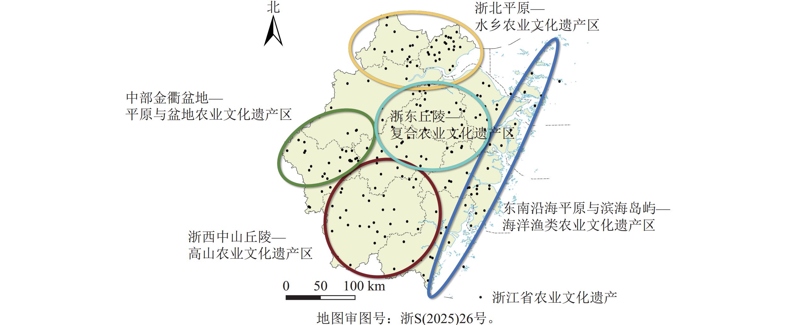 目的  浙江省是中国最早开展农业文化遗产挖掘和保护工作的省份,浙江省的中国重要农业文化遗产和全球重要农业文化遗产数量均居中国首位。研究浙江省农业文化遗产的空间分布格局和影响因素,对推动中国农业遗产保护和可持续利用具有重要借鉴意义。  方法  基于浙江省农业农村厅2024年认定的205处农业文化遗产,利用ArcGIS 10.2分析其空间格局、形态和集中程度,结合浙江省的地形对农业文化遗产进行空间分类,并分析其影响因素。  结果  浙江省农业文化遗产空间分布呈现整体分散、小范围多点聚集的形态。农业文化遗产在市域尺度上集中程度较高,主要集中在丽水市和衢州市;在县域尺度上,龙游县最为集中。浙江省农业文化遗产在空间上分为浙西中山丘陵—高山农业文化遗产区、中部金衢盆地—平原与盆地农业文化遗产区、浙北平原—水乡农业文化遗产区、浙东丘陵—复合农业文化遗产区、东南沿海平原与滨海岛屿—海洋渔类农业文化遗产区。  结论  浙江省农业文化遗产空间分布格局差异主要受高程、气候、水系等自然因素以及经济水平、人口、城镇化率、历史文化等社会因素的综合影响。图6参37