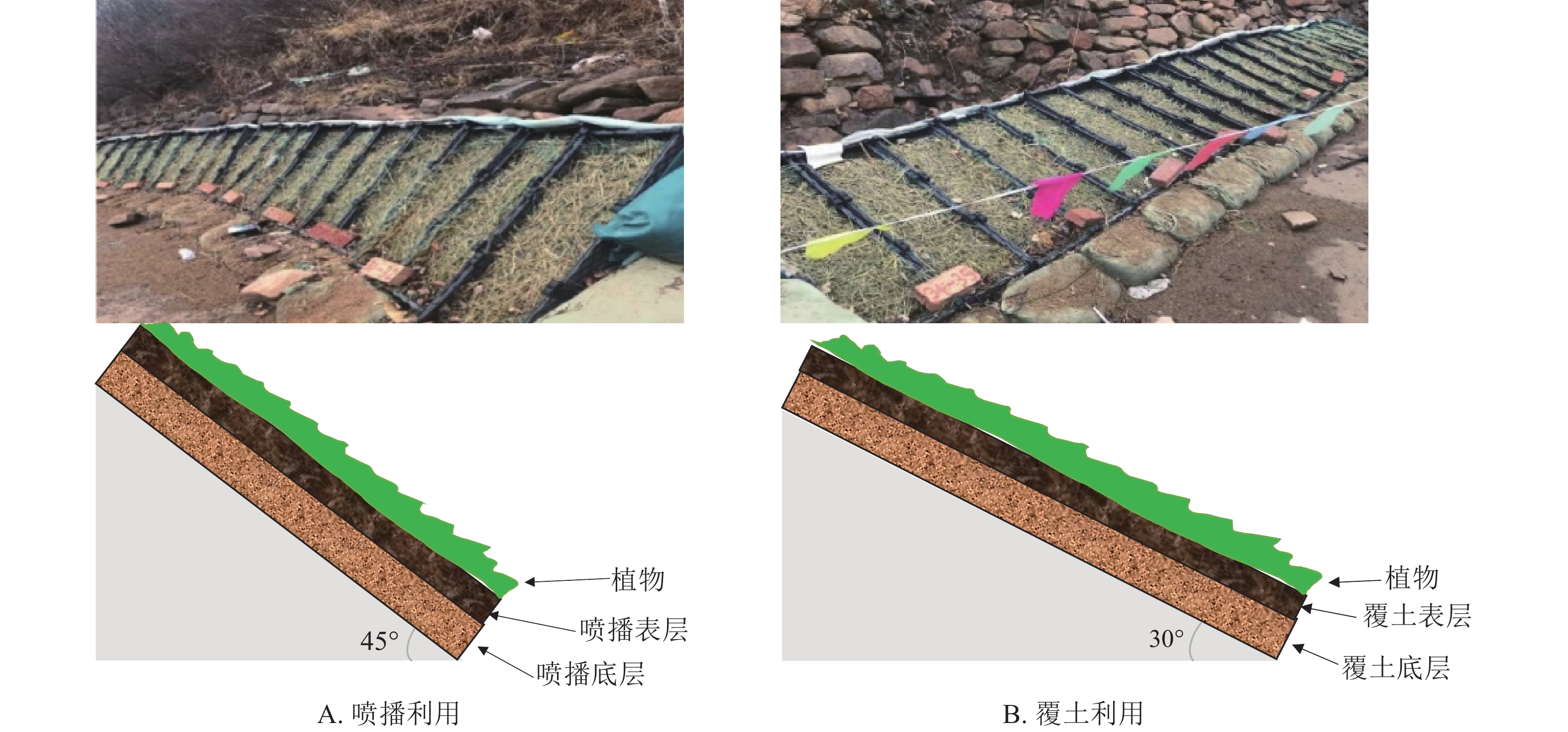 目的  研究2种表土利用方式下植被恢复效果,进一步明确表土用量少且植被恢复效果好的表土利用方式和配置。  方法  以河北省赤城县大海陀国家级自然保护区内核心区为研究区,采用种植槽布设11组喷播利用试验和7组覆土利用试验,测定植物萌发量、萌发趋势、存活率、植物群落特征、植物群落多样性指数等指标,并结合熵权-TOPSIS法综合分析2种表土利用方式下植被恢复效果。  结果  ①覆土利用的整体植被恢复效果优于喷播利用,群落组成以草本植物为主,覆土利用在植物萌发量、植物种数量、覆盖度和生物多样性指数等方面普遍表现较好。②覆土利用表层 5 cm林地表土+底层8 cm生土、表层4 cm林地表土+底层8 cm生土和喷播利用表层5 cm试验表土+底层 8 cm试验生土、表层4 cm试验表土+底层8 cm试验生土均能实现良好的植被恢复效果,建立适宜的乡土植被。③熵权-TOPSIS法评价发现:植被恢复效果最优的为覆土利用表层5 cm林地表土 +底层8 cm林地表土,喷播利用表层5 cm试验表土+底层8 cm试验表土。  结论  为达到良好的植被恢复效果的同时减少表土用量,在实际生产建设项目中,推荐覆土利用表层 5 cm林地表土+底层8 cm生土 和喷播利用表层5 cm试验表土+底层8 cm试验生土 。图5表6参31