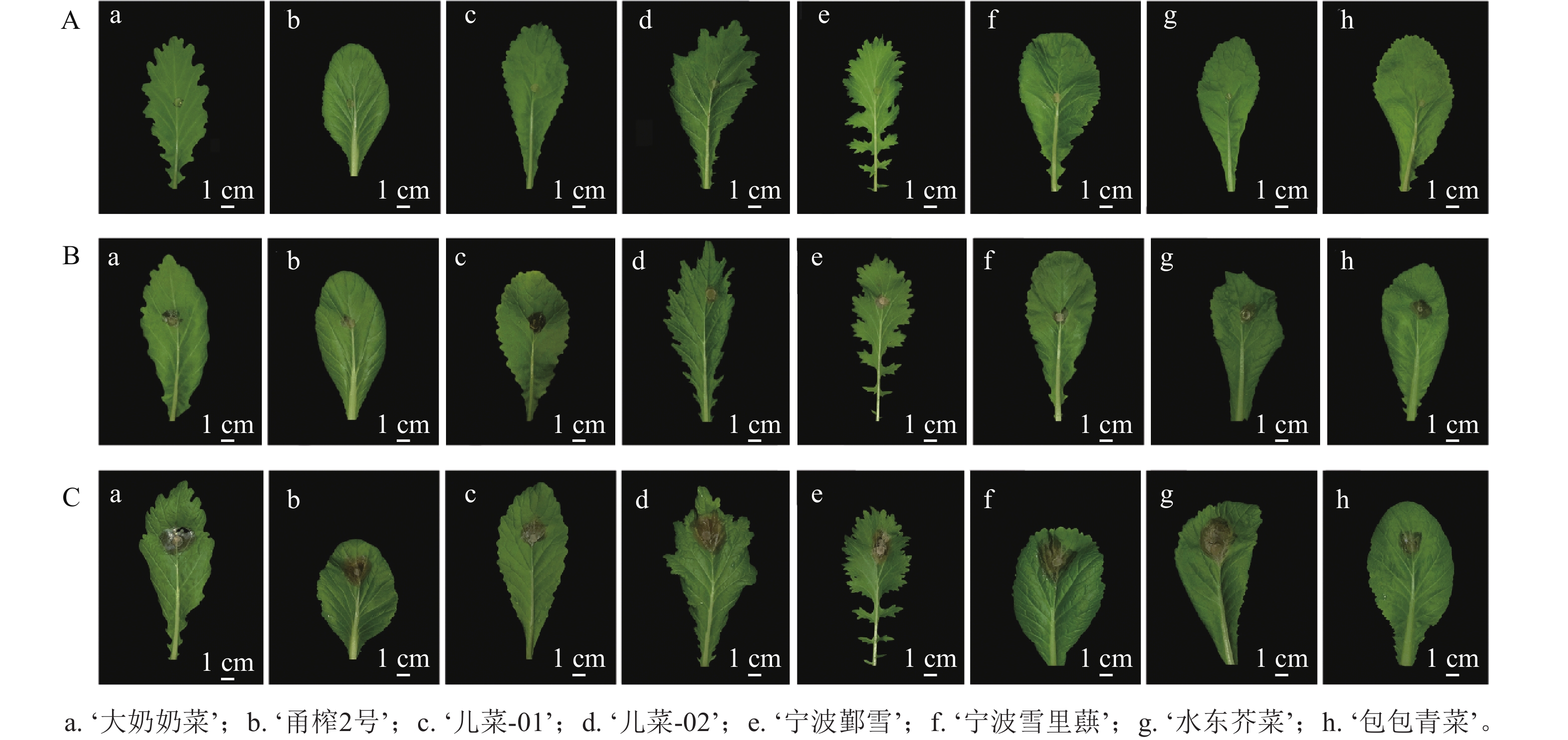 目的  对8个芥菜Brassica juncea品种叶片硫苷质量摩尔浓度进行分析,旨在探究硫苷质量摩尔浓度及组分对植株抗病性的作用。  方法  分别以4个茎用芥菜B. juncea var. tumida品种‘大奶奶菜’Danainaicai’、‘儿菜-01’‘Ercai-01’、‘儿菜-02’‘Ercai-02’、‘甬榨2号’‘Yongzha No. 2’和4个叶用芥菜B. juncea var. rugosa品种‘宁波鄞雪’‘Ningboyinxue’、‘宁波雪里蕻’‘Ningboxuelihong’、‘水东芥菜’‘Shuidongjiecai’、‘包包青菜’‘Baobaoqingcai’为试材,测定芥菜叶片硫苷质量摩尔浓度,并通过活体接种核盘菌Sclerotinia sclerotiorum测量菌斑面积进行抗病性分析。  结果  不同芥菜品种叶片总硫苷质量摩尔浓度存在差异,总硫苷质量摩尔浓度为1.851~4.844 µmol·g−1,脂肪族硫苷质量摩尔浓度为1.766~4.831 µmol·g−1,两者均为‘甬榨2号’最高,‘儿菜-02’最低;吲哚族硫苷质量摩尔浓度为0.006~0.035 µmol·g−1,‘儿菜-02’最高,‘大奶奶菜’最低;‘水东芥菜’各组分硫苷质量摩尔浓度均处于中间型。2-丙烯基硫苷在所有品种中占总硫苷质量摩尔浓度的95%以上。在12 h时,‘儿菜-01’菌斑面积最大,在24 h时,‘包包青菜’菌斑面积最大,‘甬榨2号’菌斑面积在2个时间点均为最小;在36 h时,‘宁波雪里蕻’菌斑面积最大,‘大奶奶菜’最小(P<0.05)。  结论  芥菜对病原菌的抗性与硫苷总量、组分质量摩尔浓度及其比例密切相关,茎用芥菜总硫苷质量摩尔浓度高于叶用芥菜,‘甬榨2号’对核盘菌的抗性最强,其次为‘水东芥菜’。图4表2参29