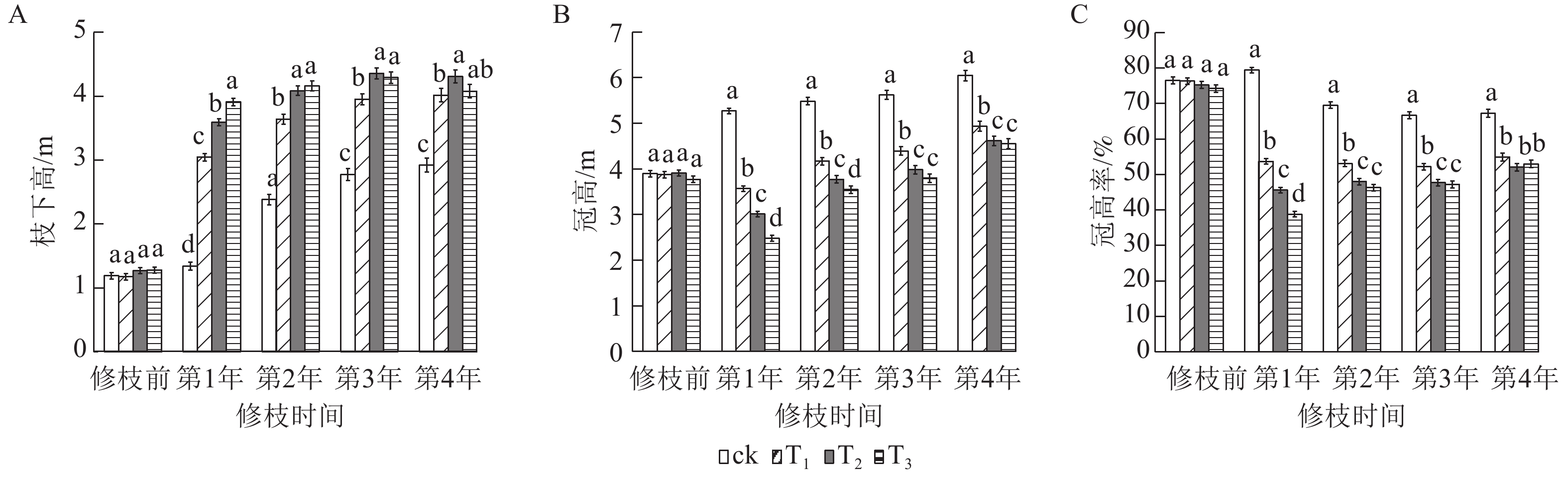 目的  研究不同修枝强度对格木Erythrophleum fordii生长和干形的动态影响,为格木修枝抚育提供理论依据。  方法  以4年生格木纯林为研究对象,采用不修枝(对照,ck),以及低强度修枝(修去树高1/3以下的枝条,T1)、中强度修枝(修去树高1/2以下的枝条,T2)、高强度修枝(修去树高2/3以下的枝条,T3)等4个处理,各修枝处理均为 9行 72 株小区,设4次重复。连续4 a测定树高、胸径、冠幅和枝下高等,利用方差分析、多重比较分析研究不同修枝强度及不同年度对树高、胸径、材积、冠幅、高径比、胸高形数、枝下高、冠高、冠高率的影响。  结果  低强度修枝对胸径和材积显著的促进作用集中在修枝后第1年(P<0.05)。高强度修枝对树高和材积的抑制作用在修枝后第1年和第3年较为明显,其中对树高的抑制作用达到显著水平(P<0.05)。修枝对冠幅的调控呈现阶段性特征,修枝后第1年冠幅不降反增,第2年出现负增长且随着修枝强度的增加而减弱,第4年各修枝强度无显著差异。修枝显著提高枝下高(P<0.05),降低冠高、冠高率和高径比,表明早期修枝在优化树形的同时可能降低干材饱满度。  结论  格木生长对修枝的响应呈现显著的年度波动性,影响作用集中在修枝后第1年,后续影响减弱,第4年后无显著影响。综合生长及干形指标,低强度修枝在胸径、材积和枝下高间实现最佳平衡,是培育大径材的最优策略。图2表7参25