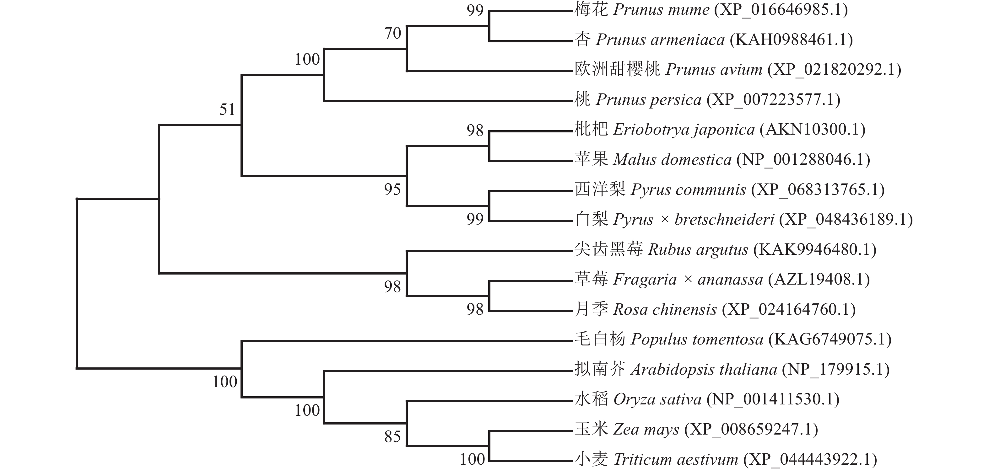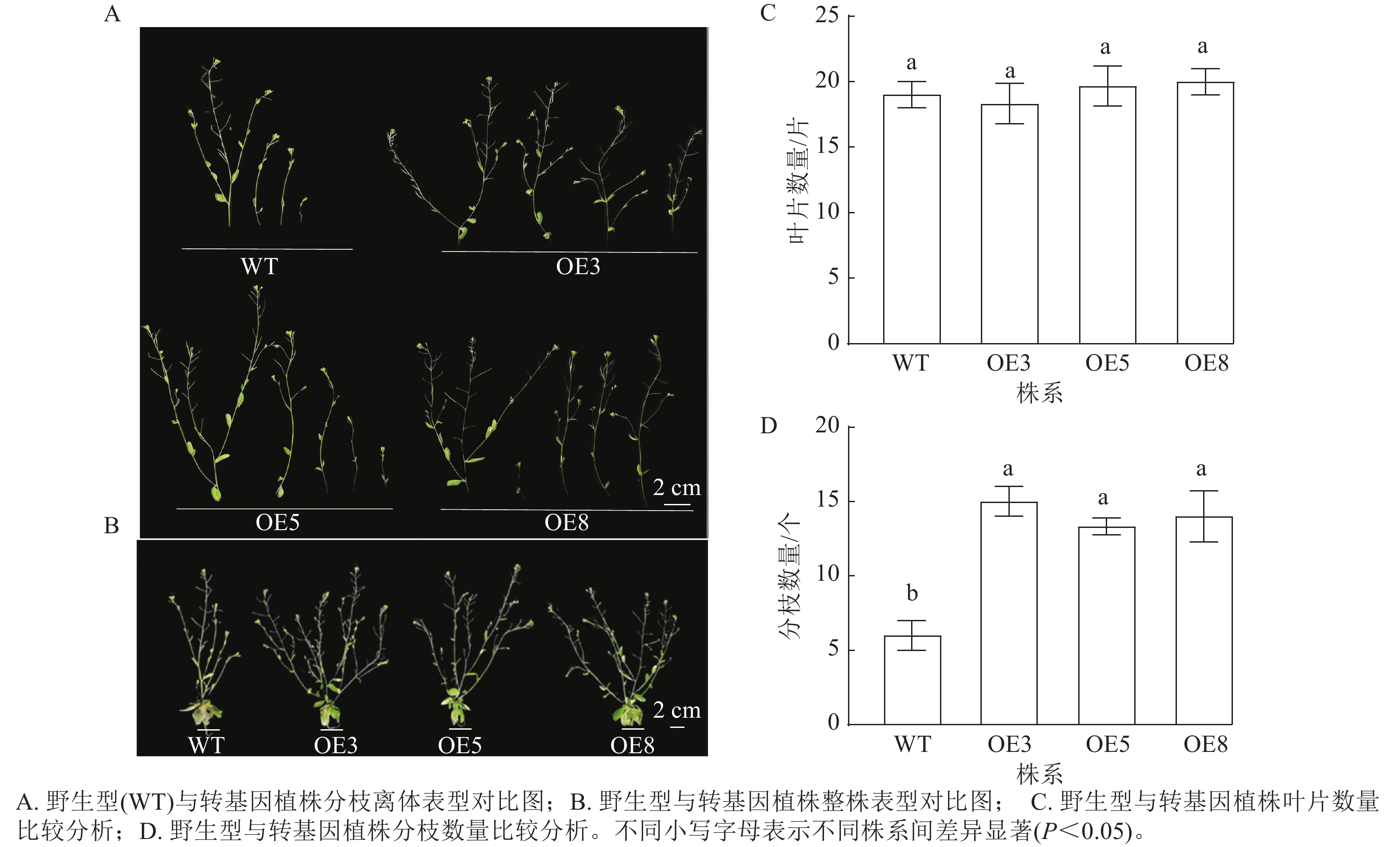 目的  揭示梅花Prunus mume株型性状形成的分子机制,明确AP2/ERF转录因子家族在梅花分枝调控中的作用,以期为梅花株型改良提供理论依据和候选基因。  方法  通过基因克隆技术获得PmERF011基因序列,采用生物信息学方法分析其系统进化关系及启动子顺式作用元件;利用实时荧光定量PCR检测该基因在梅花不同组织(根、茎、叶)中的时空表达模式;构建过表达载体并转化拟南芥Arabidopsis thaliana,通过表型观察和统计分析验证转基因功能。  结果  PmERF011属于AP2/ERF转录因子家族,与蔷薇科Rosaceae近缘物种(桃P. persica、杏P. armeniaca)高度同源,但与拟南芥、水稻Oryza sativa等差异显著;启动子顺式作用元件分析发现:PmERF011含茉莉酸甲酯与生长素响应元件;组织特异性检测结果显示:PmERF011在根与茎木质部中表达量最高,叶片中表达量较低。转基因拟南芥结果表明:过表达PmERF011显著增加了拟南芥侧枝数量(P<0.05)。  结论  PmERF011具有促进分枝增多的功能,是梅花和李属Prunus植物株型改良的候选基因。图7表2参46