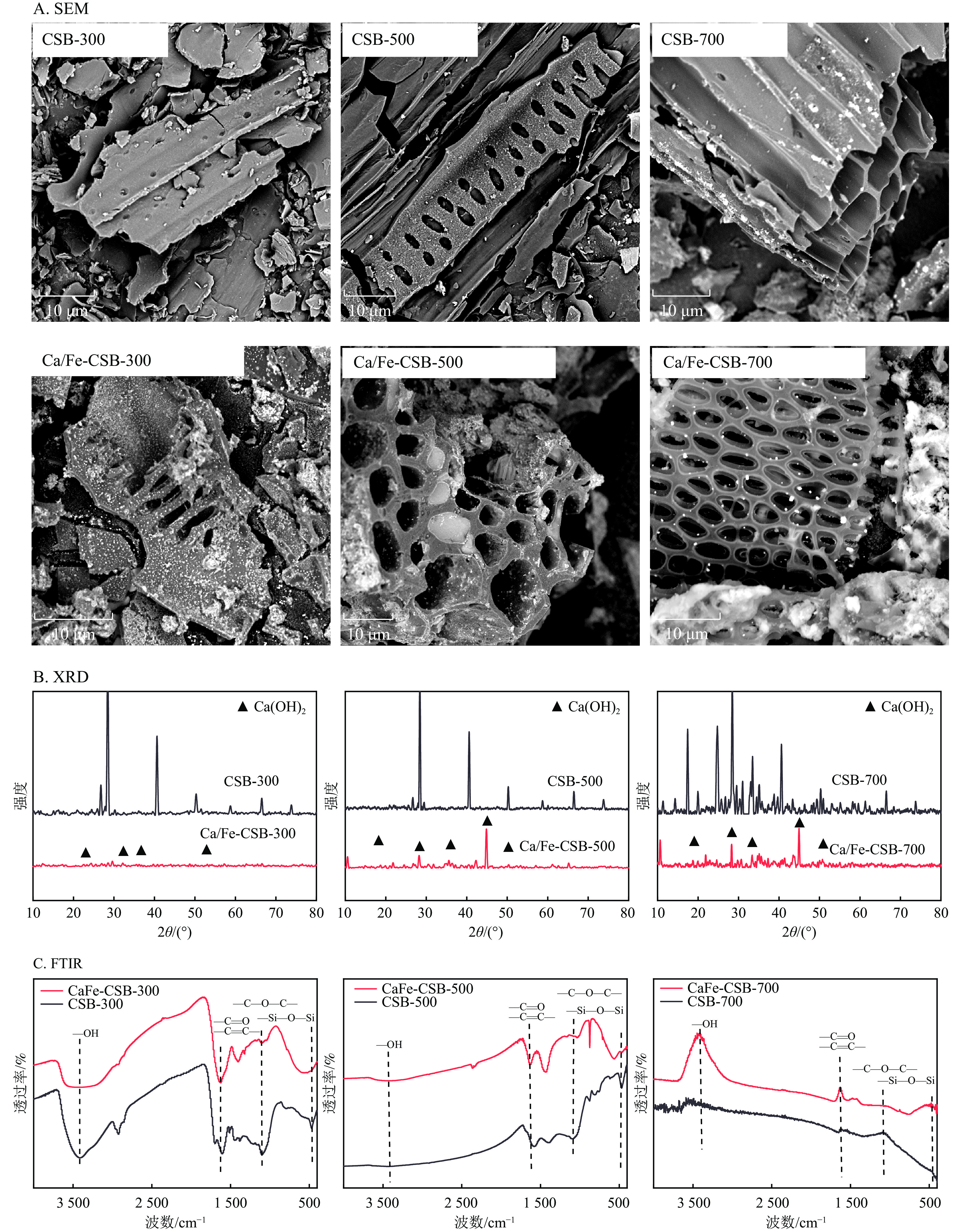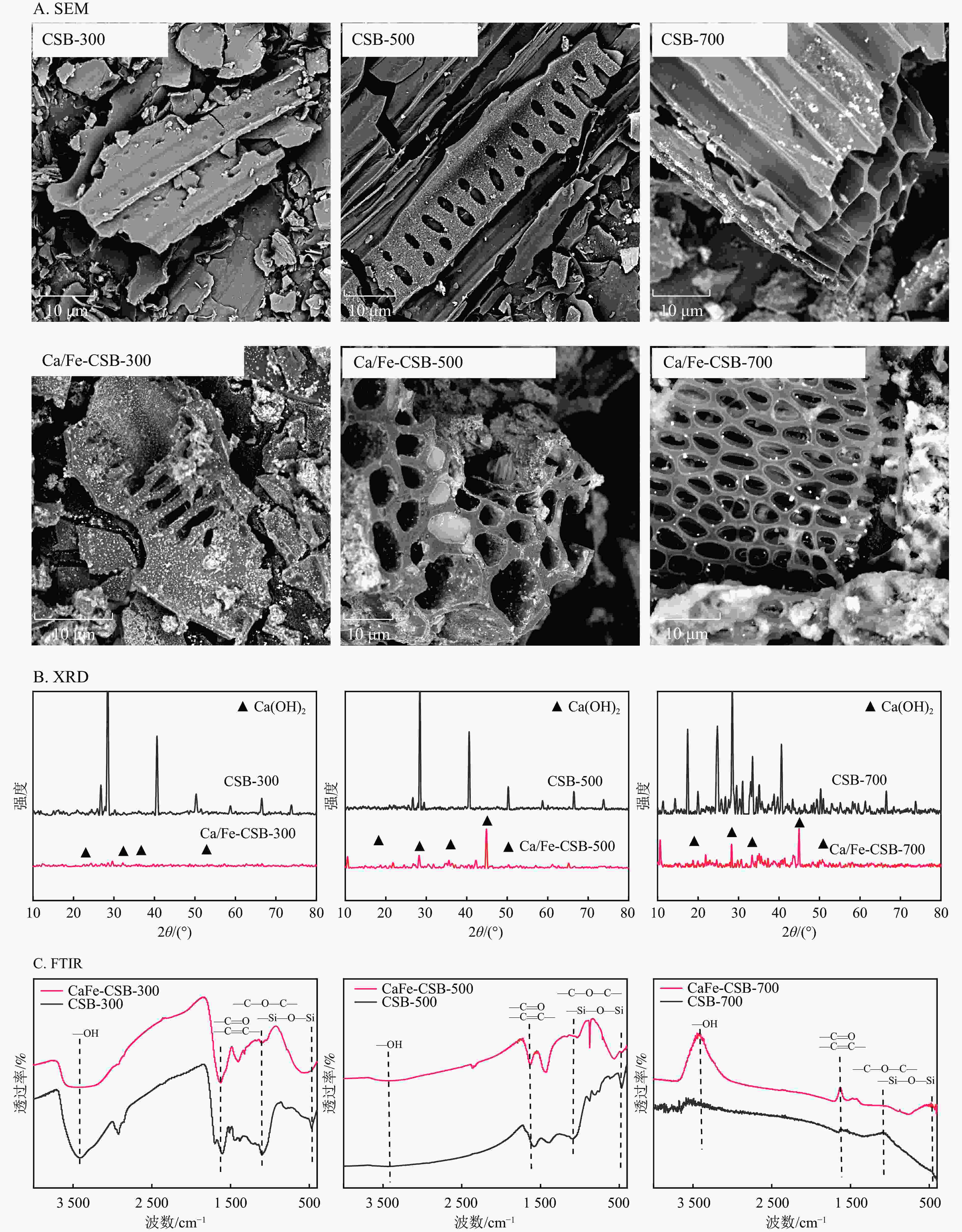 目的 探讨不同热解温度及钙铁(Ca/Fe)改性对生物质炭的孔隙结构及其对水体中磷酸盐吸附性能的影响,为改性生物质炭在水处理领域的应用提供参考。 方法 在300、500和700 ℃下制备未改性及Ca/Fe改性生物质炭,通过扫描电子显微镜(SEM)、X射线衍射仪(XRD)和傅里叶红外光谱仪(FTIR)等技术分析改性生物质炭的微观结构和表面化学性质,通过吸附实验评估不同热解温度、投加量、pH及共存离子对磷酸盐去除效果的影响,并采用等温线和动力学模型解析其吸附机制。 结果 随着热解温度的升高,生物质炭孔隙结构逐步发育,尤其在700 ℃下,Ca/Fe改性生物质炭表现出高度有序的孔隙结构和较大的比表面积,最大磷吸附量达890.836 mg·g−1,对磷酸盐的去除率达90.32%。吸附等温线分析符合Sips模型,动力学实验符合准二级模型,表明对磷酸盐的吸附过程主要由化学吸附驱动。XRD分析表明:高温下形成的氢氧化钙晶相增强了磷酸根离子的固定吸附。溶液pH、投加量和共存离子对吸附性能有影响,碱性条件和适宜的投加量可有效促进磷酸盐的去除,而硝酸根、硫酸根等阴离子则表现出抑制作用。 结论 调控热解温度和Ca/Fe改性条件能够显著优化生物质炭的孔隙结构及其吸附性能。Ca/Fe改性生物质炭是一种高效去除水体磷污染的新型材料。图5表4参32