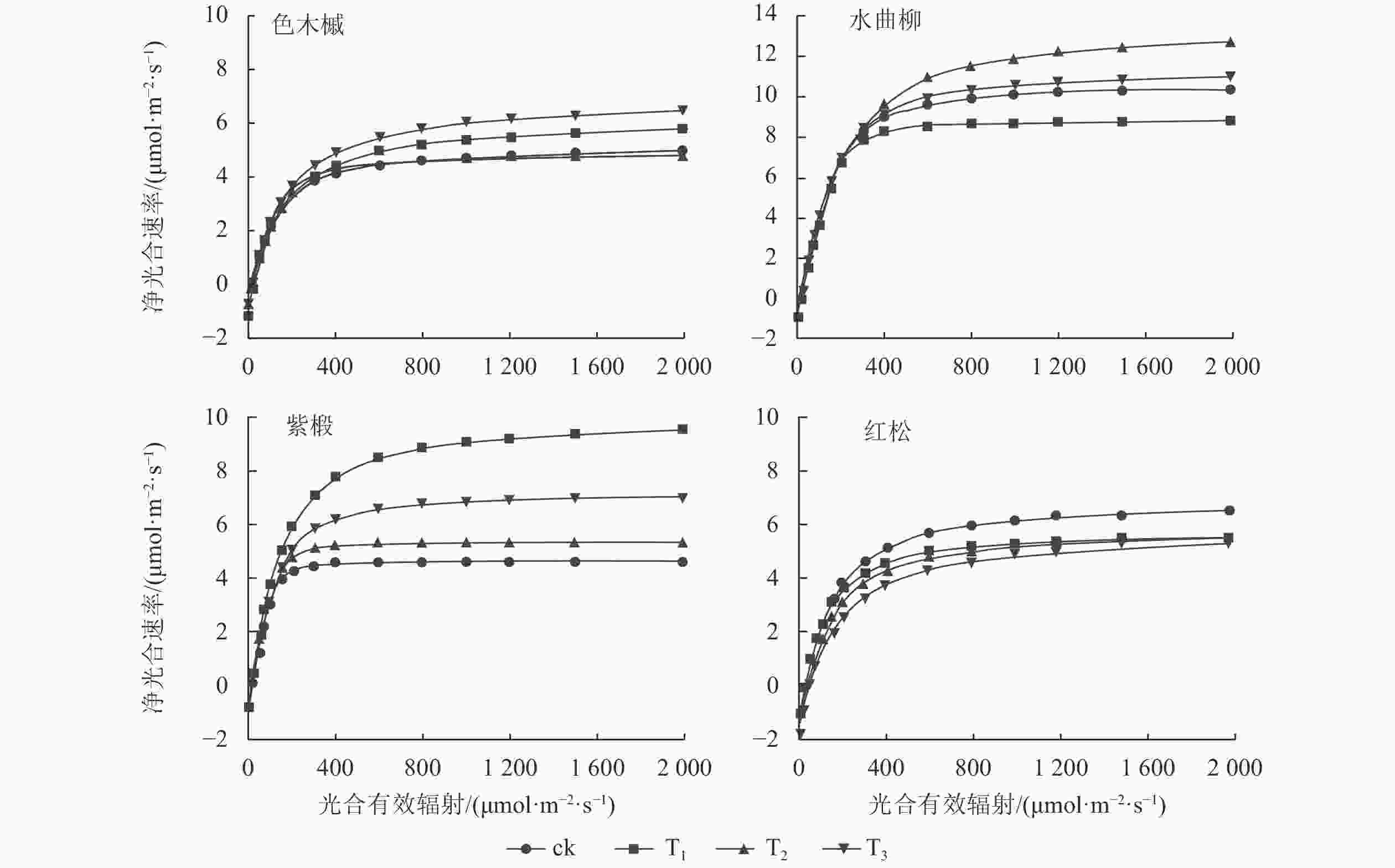 目的 采伐是森林生态系统重要的干扰因子。研究不同采伐强度对针阔混交林叶功能性状的影响可为采伐后树种的恢复提供科学依据。 方法 以吉林蛟河针阔混交林中4种主要树种(色木槭Acer mono、水曲柳Fraxinus mandshurica、紫椴Tilia amurensis和红松Pinus koraiensis)为研究对象,设置对照(ck,采伐强度为0)、轻度采伐(T1,17.24%)、中度采伐(T2,34.74%)和重度采伐(T3,51.85%) 4种不同处理,采集样品,分析其光合特性、叶结构性状等叶功能性状指标。运用单因素方差分析和最小显著差异法比较不同采伐处理的差异。 结果 不同采伐强度对色木槭、水曲柳、紫椴和红松4种树种的光合特性与叶结构性状产生了显著影响,色木槭、水曲柳、紫椴和红松的最大净光合速率分别在采伐强度为T3、T2、T1和ck处理下最大,分别在采伐强度为T2、T1、ck和T3时最小。通过叶结构性状分析发现:色木槭、水曲柳和紫椴比叶重在T1时最大,色木槭与水曲柳的叶干物质质量分数在T3时最大,水曲柳与紫椴的叶组织密度在T1时最大,而色木槭则在T2时最大。各树种的叶绿素相对含量在种内差异均不显著。 结论 采伐影响了各树种光合特性和叶结构性状:阔叶树种色木槭、水曲柳、紫椴分别在T3、T2、T1采伐强度下碳同化能力最强,且采伐能够提升各阔叶树种叶结构性状参数;红松的光合能力随采伐强度增加而下降,叶结构性状不随采伐强度变化。低强度的采伐可提高吉林蛟河针阔混交林中阔叶树种的光合能力及资源配置效率,高强度的采伐会造成红松适应不良。图1表4参48