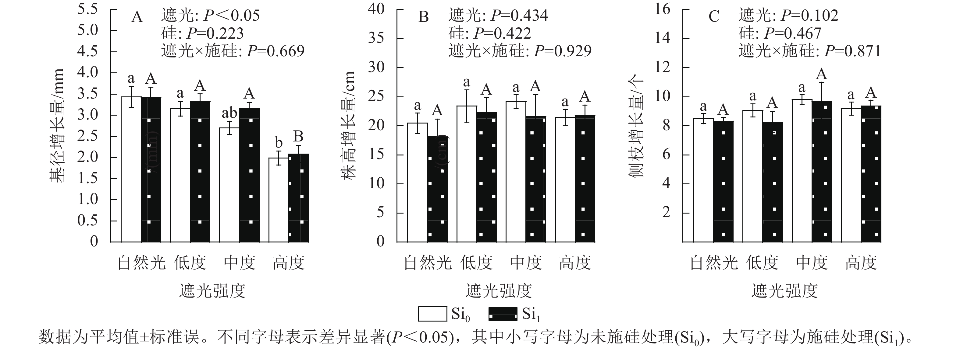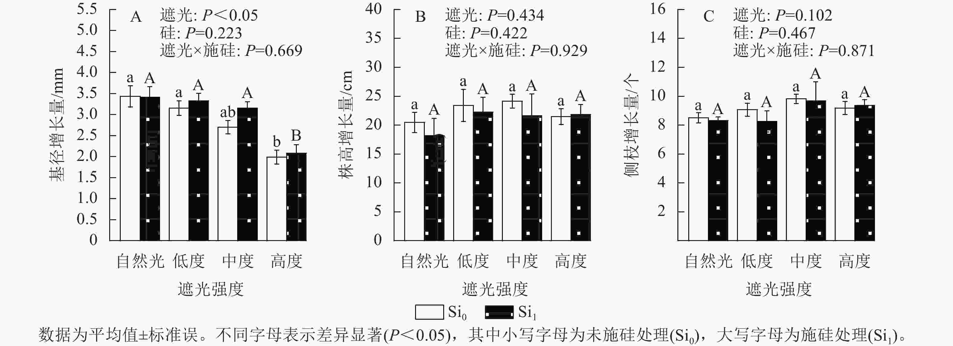 目的 探索侧柏Platycladus orientalis幼苗对弱光环境的适应机制,阐明外源硅对遮光胁迫的缓解效应。 方法 以3年生侧柏幼苗为材料,采用黑尼龙网覆盖,设置自然光、低度遮光、中度遮光和高度遮光的4种遮光梯度,结合0 (Si0)和2 mmol·L−1 (Si1)硅酸钠外源硅处理水平,两者随机组合为8种处理。测定不同处理侧柏幼苗生长指标以及光合色素、渗透调节和抗氧化等的生理指标,分析幼苗弱光适应特征及硅的调控效应。 结果 ①遮光处理显著抑制侧柏基径生长,抑制幅度达5.18%~40.51% (Ρ<0.05);施硅处理促进基径生长,增粗幅度达4.72%~16.67%。遮光环境可促进株高生长,但在自然光和中低度遮光条件下,施硅处理抑制株高生长。说明在一定的光强范围内施硅处理具有“基径增粗-顶端抑制”双向调控效应。②光强降低,叶绿素a和叶绿素b质量分数总体呈上升趋势,叶绿素a/b总体呈下降趋势,有利于在低光强时提升光合系统对光的捕获效率。③遮光诱导渗透调节物质动态响应(可溶糖、游离脯氨酸质量分数先升后降,可溶性蛋白质量分数先降后升),增强抗氧化酶保护[过氧化物酶和过氧化氢酶活性升高,丙二醛质量摩尔浓度显著降低(Ρ<0.01) ];外源硅强化渗透调节和抗氧化能力,提升了可溶性糖、蛋白质质量分数及过氧化物酶活性,降低了丙二醛质量摩尔浓度。 结论 侧柏幼苗利用叶绿素合成增强光捕获能力,激活抗氧化酶防御以提高耐荫性;外源硅能不同程度地优化形态建成,并通过提高渗透调节和抗氧化特性,提升幼苗抵御弱光胁迫的能力。图4表2参39