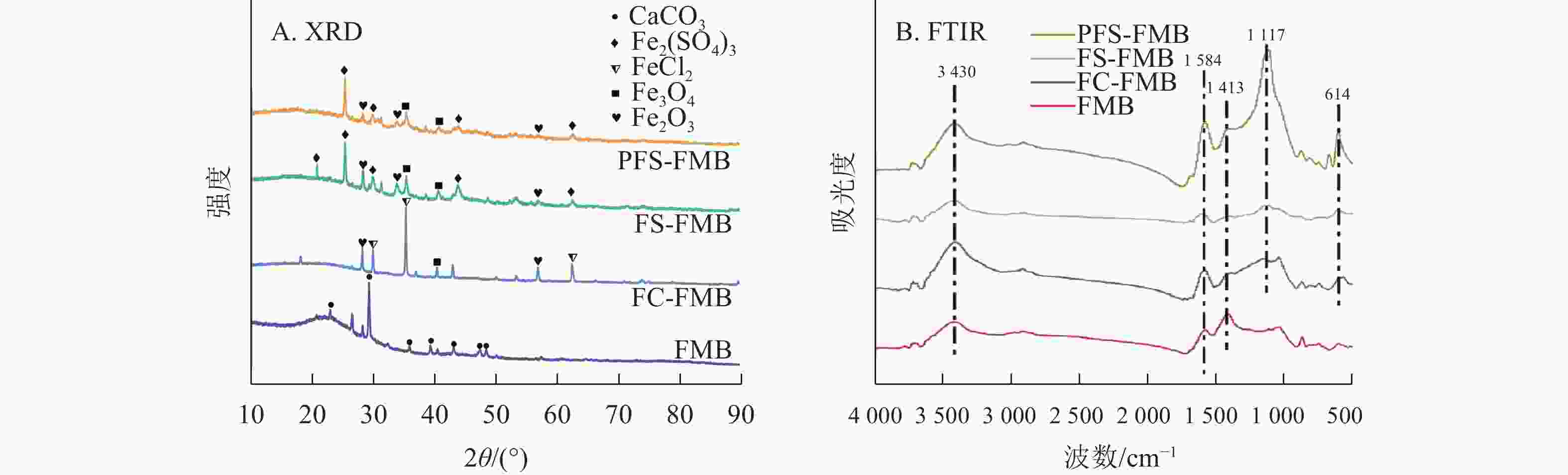 (m2·g−1)FMB 10.07 216.03 685.01 27.94 7.89 19.44 FC-FMB 4.72 387.24 435.28 23.58 48.62 84.79 FS-FMB 5.35 421.59 428.45 15.82 41.38 96.01 PFS-FMB 5.46 486.32 380.93 18.44 42.17 101.55 XRD分析结果如图2A所示:细叶榕枝条生物质炭的主要晶体结构为方解石(CaCO3)。在铁基改性生物质炭的衍射图谱中,于25°~45°处均观察到铁氧化物的特征衍射峰。FC-FMB图谱中出现了氯化亚铁(FeCl2)的特征衍射峰,而FS-FMB和PFS-FMB图谱中则显示出Fe2(SO4)3的特征衍射峰。这些特征衍射峰表明,铁基改性材料已成功负载于生物质炭表面。