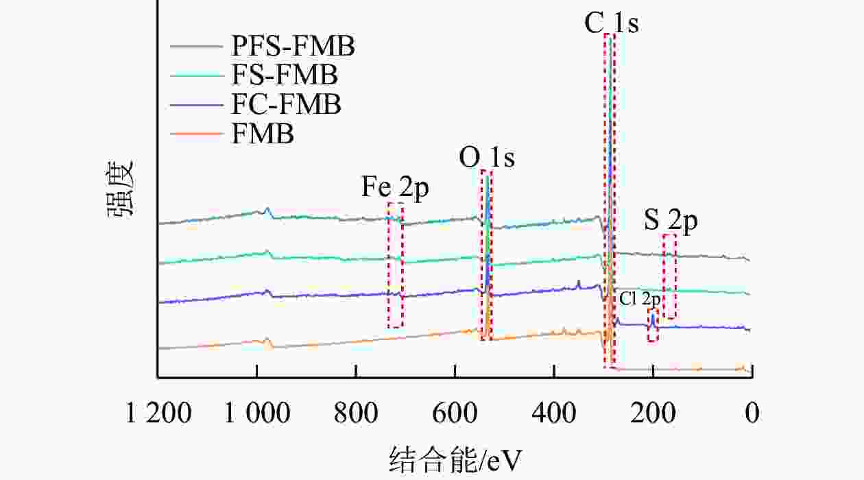 XPS分析结果显示(图3):生物质炭在结合能284.8 eV处检测到C 1s峰,在532.03 eV处检测到O 1s峰。对于铁基改性生物质炭,FC-FMB在200.58 eV处出现了Cl 2p峰,而FS-FMB和PFS-FMB则在163.34 eV处检测到S 2p峰。此外,3种铁基改性生物质炭均在710.87 eV处共同出现了Fe 2p峰。这些特征峰的出现表明,不同改性生物质炭的表面已成功负载了相应的基团,进一步证实了铁基材料及其他改性元素在生物质炭表面的引入。