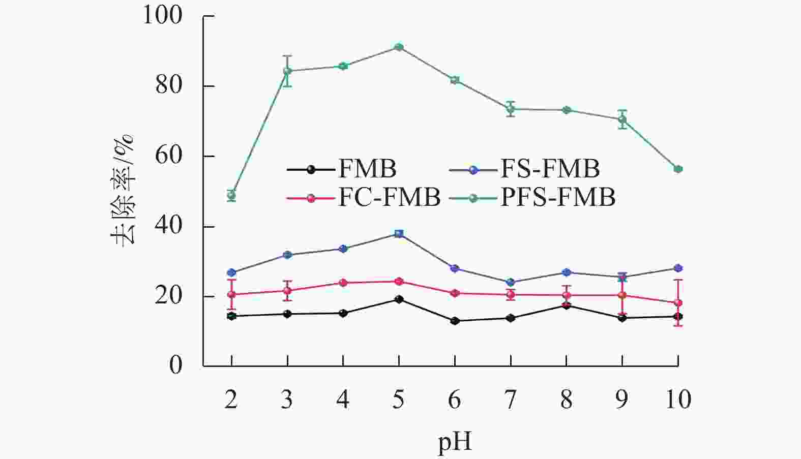 分别称取0.05 g FMB、FC-FMB、FS-FMB、PFS-FMB置于50 mL离心管,加入20 mL质量浓度为40 mg·L−1(以As计),初始pH分别为2、3、4、5、6、7、8、9、10的NaAsO2溶液(采用0.1 mol·L−1 NaOH或0.1 mol·L−1 HNO3调节溶液pH),置于恒温振荡箱中,在恒温25 ℃及 220 r·min−1条件下振荡24 h。然后在4 000 r·min−1条件下离心10 min,取上清液过0.45 μm滤膜(PES)后,利用电感耦合等离子体发射光谱仪(ICP-OES,PerkinElmer 8300)测定As质量浓度。