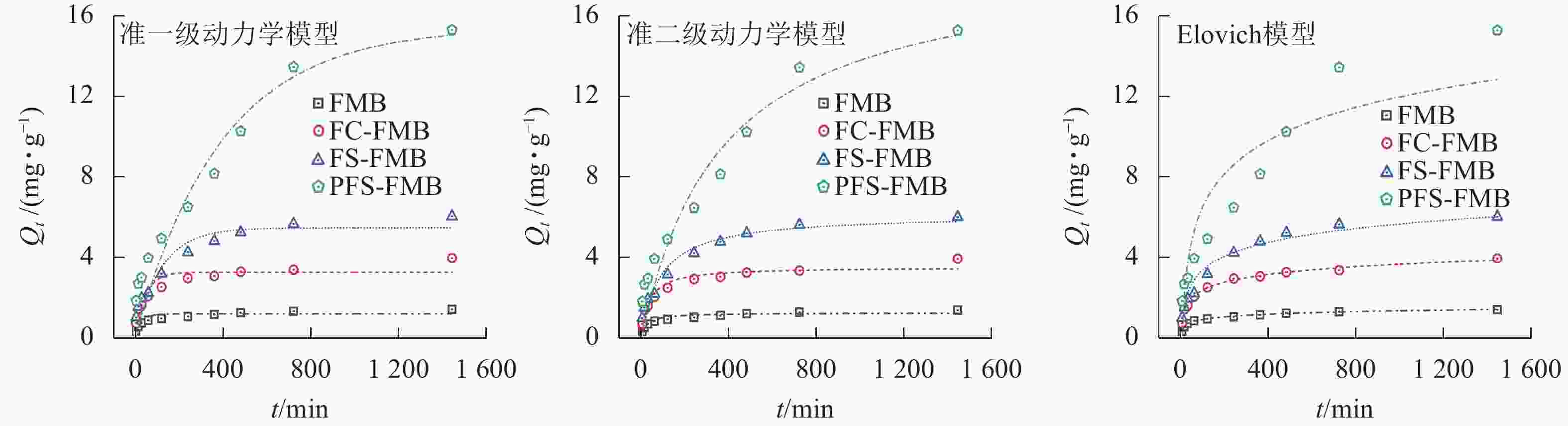 分别称取0.05 g FMB、FC-FMB、FS-FMB、PFS-FMB置于50 mL离心管中,加入20 mL质量浓度为60 mg·L−1的NaAsO2溶液(pH为5)。将离心管放入恒温振荡箱中,在25 ℃、220 r·min−1 条件下振荡5、15、30、60、120、240、360、480、720、1 440 min。振荡后取出,4 000 r·min−1条件下离心10 min,上清液过0.45 μm滤膜,稀释后利用ICP-OES测定As质量浓度。