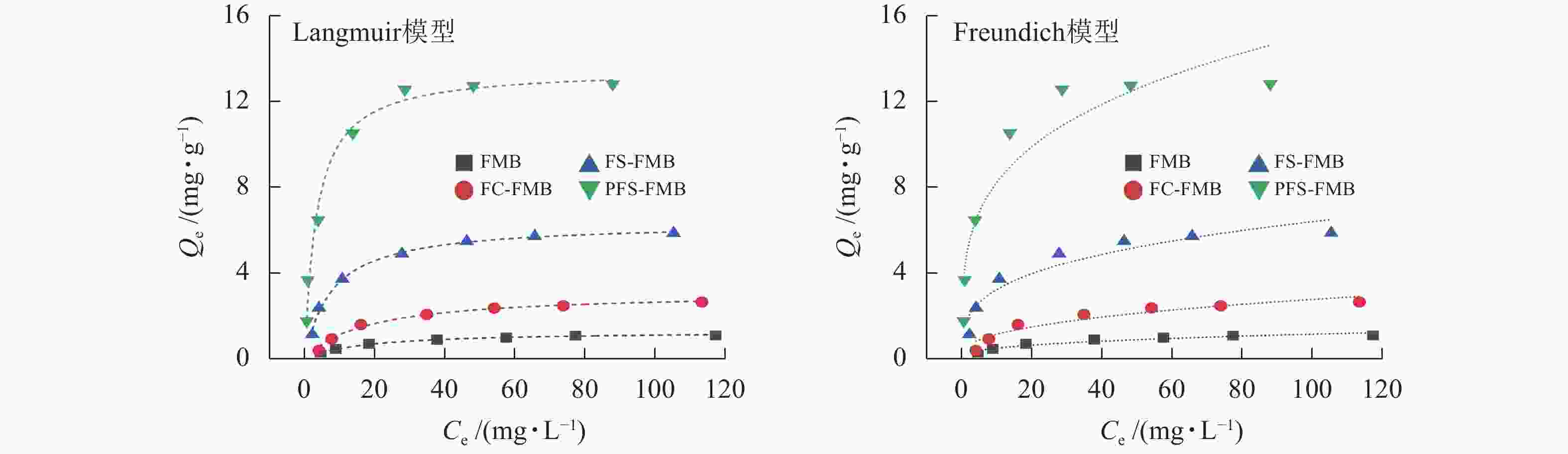 生物质炭Langmuir模型 Freundlich模型 Qm/(mg·g−1) KL R2 KF/(mg1−N·LN·kg−1) N R2 FMB 1.290 0.059 0.983 0.215 0.364 0.888 FC-FMB 3.111 0.057 0.985 0.478 0.382 0.892 FS-FMB 6.357 0.130 0.993 1.639 0.296 0.889 PFS-FMB 13.527 0.293 0.982 4.486 0.264 0.878 -