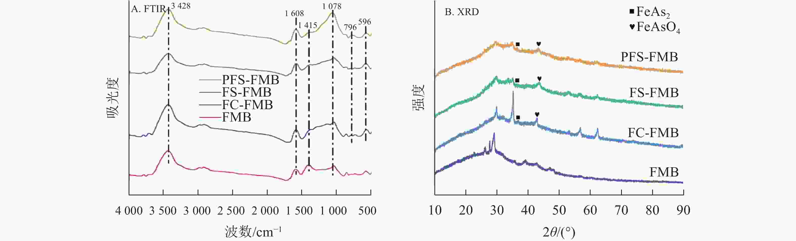 生物质炭吸附As(Ⅲ)后的FTIR分析结果显示(图7A):As(Ⅲ)吸附后,—OH吸收带出现了轻微位移,C—O吸收带在1 078 cm−1处以及Fe—O吸收带在596 cm−1处的强度有所降低。此外,铁基改性生物质炭在796 cm−1处出现了新的吸收峰,该峰归因于As—O—Fe键的振动[41]。这些变化表明:在吸附过程中,生物质炭表面的含氧官能团参与了吸附反应,且Fe—O键的结构发生了变化。As—O—Fe键的形成解释了Fe—O峰的位移现象,并进一步证实了内层络合物的生成[42]。PFS-FMB在796 cm−1处吸收峰强度最大,这与其表现出对As(Ⅲ)的最佳吸附性能相一致。此外,C=O振动带在1 415 cm−1处的变化表明:吸附质可能在生物质炭表面的芳香族化合物上发生了亲电取代反应[43]。这些结果表明:铁基改性生物质炭对As(Ⅲ)的吸附过程不仅涉及表面络合反应,还可能包括生物质炭表面官能团与As(Ⅲ)之间的化学键合。