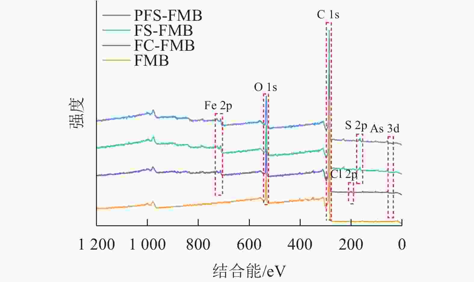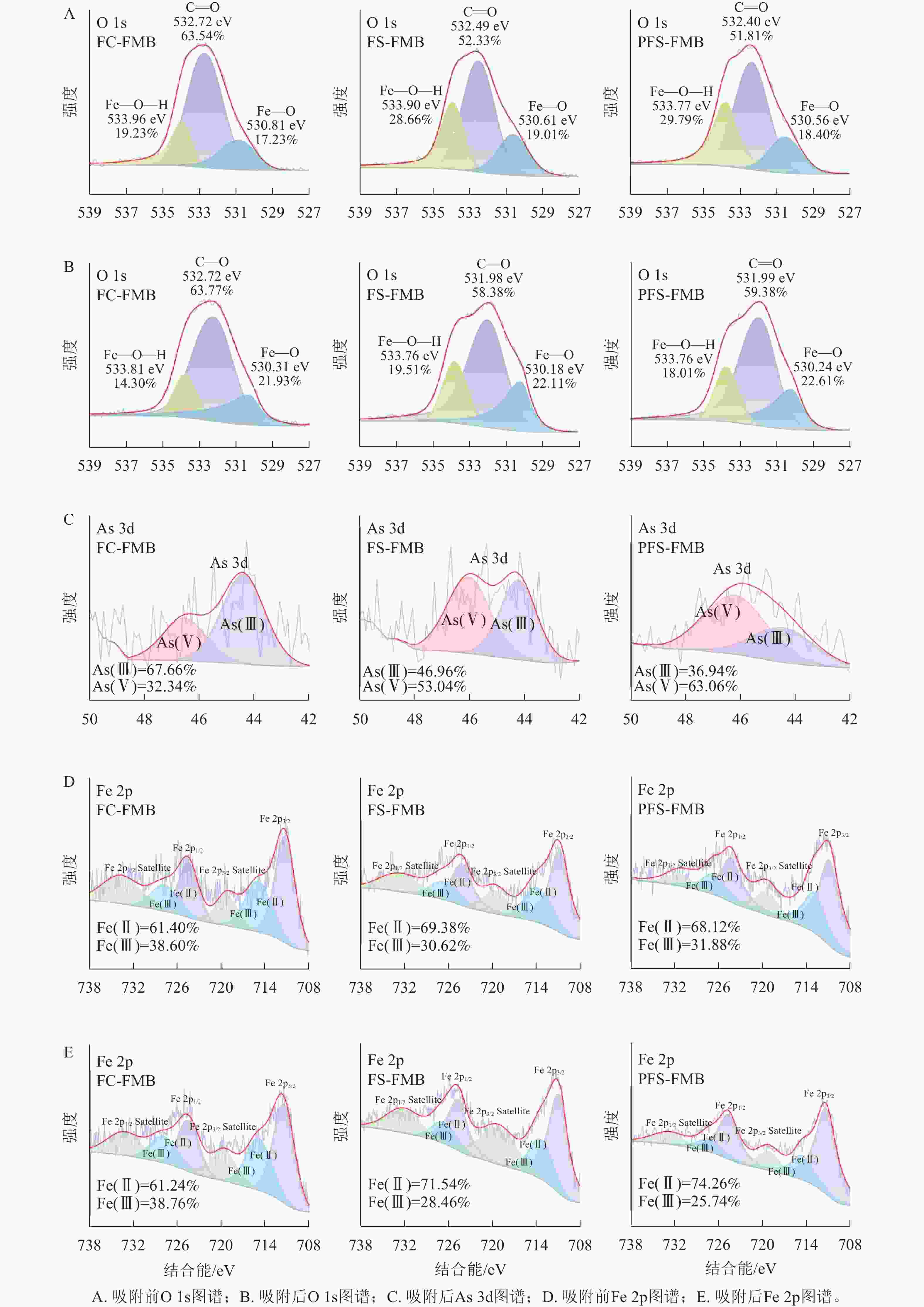 生物质炭吸附As(Ⅲ)后的XRD图谱(图7B)与原始图谱(图2A)相比,改性生物质炭在吸附As(Ⅲ)后均形成了新的矿物相。由于对As(Ⅲ)的吸附能力较弱,FMB在吸附As(Ⅲ)后未检测到明显的含砷化合物特征峰。相比之下,铁基改性生物质炭在吸附As(Ⅲ)后表现出明显的矿物相变化。首先,检测到了斜方砷铁矿(FeAs2)的存在,这表明共沉淀生成不溶性物质是铁基改性生物质炭去除As(Ⅲ)的重要机制之一。此外,检测到的FeAsO4矿物相进一步证实了Fe与As(Ⅲ)反应生成了低迁移性物质。这一结果表明:铁基改性生物质炭能够通过将As(Ⅲ)氧化为毒性较低的As(Ⅴ),从而实现对As(Ⅲ)的高效去除[44]。