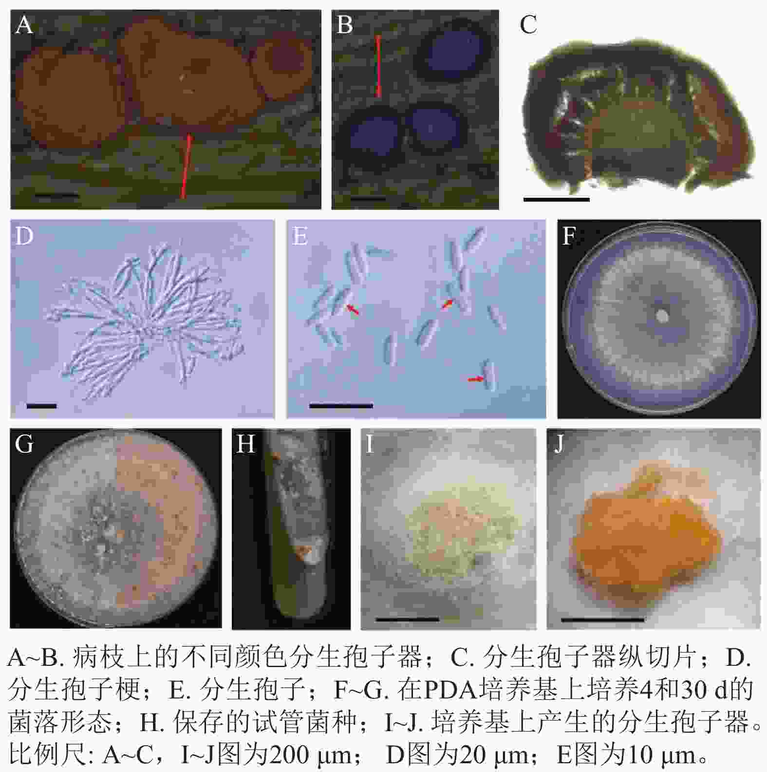 • 病原菌分生孢子器半埋生于寄主树枝表皮下,近圆形至不规则形,橙红色,老后转变为黑色,直径为240~630 μm (n=30),表面光滑,单生,内部脑状(图2A~C)。分生孢子梗无色透明,顶端具有小梗,不分叉(图2D)。分生孢子大小为(4.75~7.25) μm× (1.25~2.25) μm,平均为5.5 μm×2.0 μm (n=50),单孢,椭圆形,部分微弯曲,无隔(图2E)。未发现有性型。菌落在PDA培养基上呈辐射状生长,绒毛状,最初为纯白色,后期稍显污白色,质地均匀,边缘波浪状或平整,25 ℃全黑暗培养条件下最快6 d可以长满PDA培养基,之后经光照刺激,14 d 即可产生橙色的分生孢子器,菌落背面逐渐产生橙红色色素(图2F~J)。