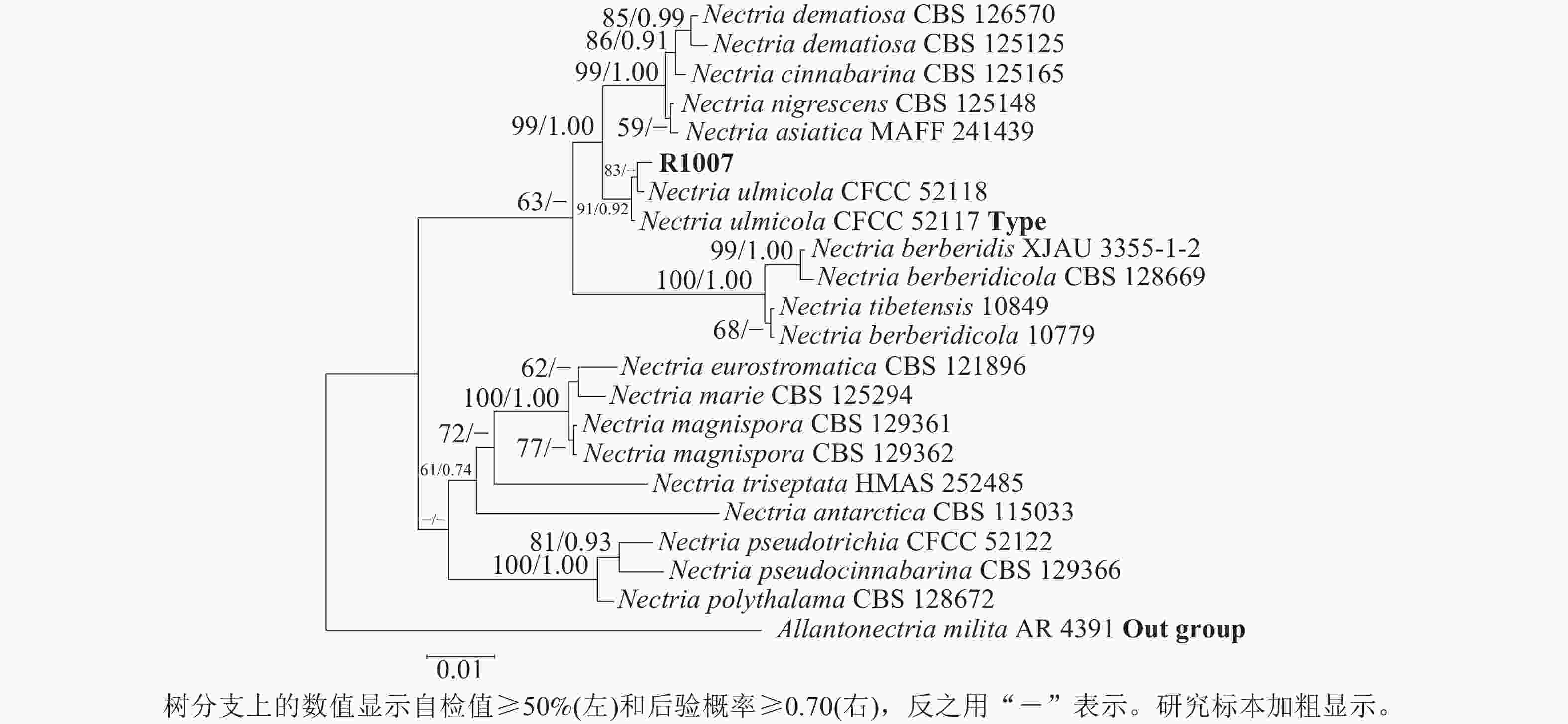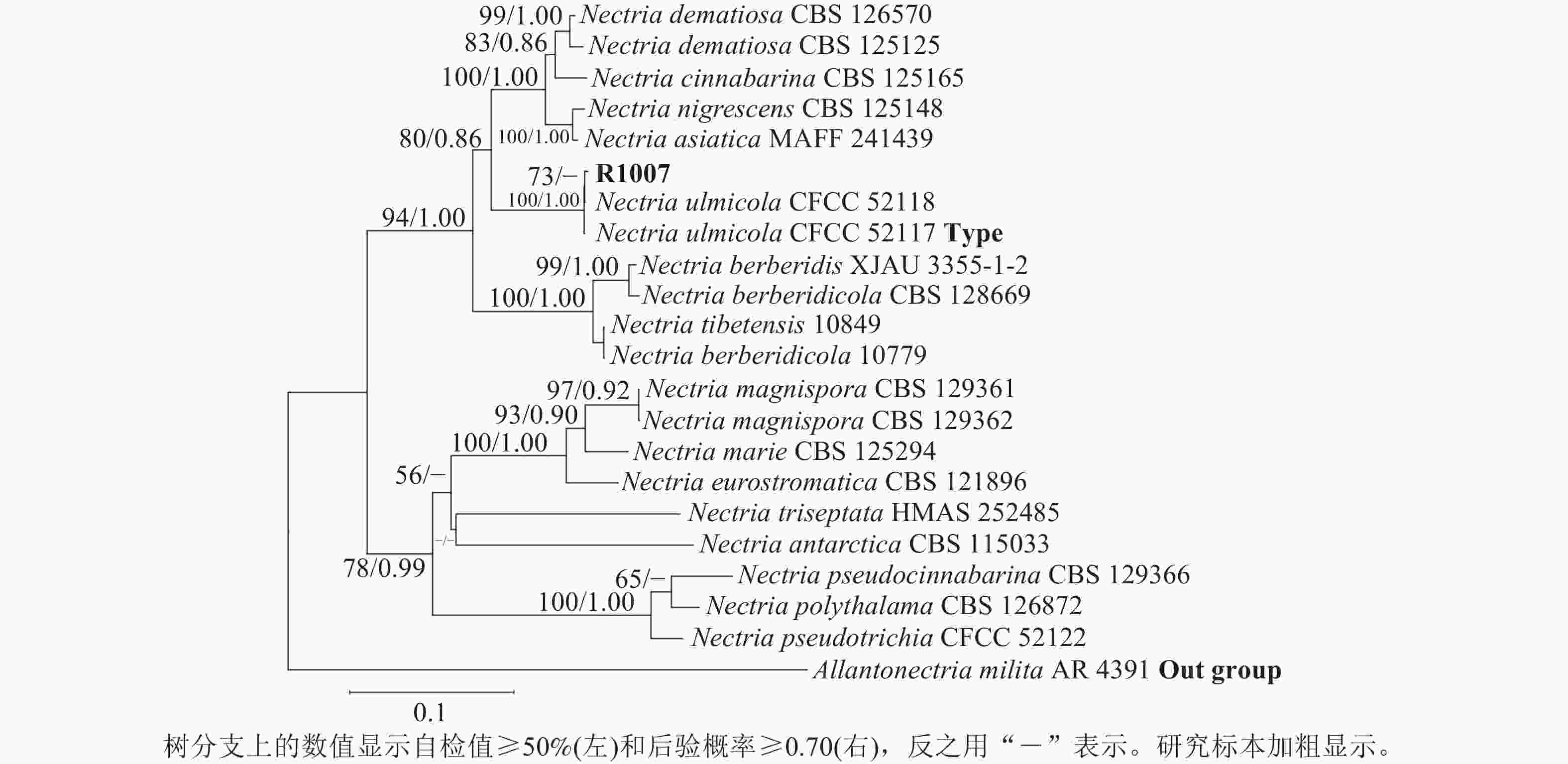 丛赤壳属Nectria是丛赤壳科Nectriaceae的模式属,由Rossman在1989年建立,无性型为瘤座孢属Tubercularia。该属的真菌是广泛分布于北半球温带地区的典型木本植物病害病原菌,还能侵染一些草本植物,为害时在寄主植物枝条上形成近球形到球形、红色到暗红色的柔软肉质子实体[46]。国内已报道的该属病害不多,文献报道的有血红丛赤壳N. haematococca引起的大豆Glycine max茎腐病和黄檗Phellodendron amurense枝干腐烂病;假毛丛赤壳N. pseudotrichia引起的草莓Fragaria ananassa茎腐病、山茶Camellia japonica溃疡病和香椿Toona sinensis溃疡病;朱红丛赤壳N. cinnabarina引起的核桃Juglans regia枯枝病以及松丛赤壳菌N. cucurbitula引起的油松Pinus tabuliformis枯枝病[713]。此外,2015—2020年,国内学者报道了丛赤壳属的3个新物种,即N. zangii、榆生丛赤壳N. ulmicolaN. berberidis[56, 14]。结合现有资料,丛赤壳属近40种真菌,国内分布有17种[56, 1415]