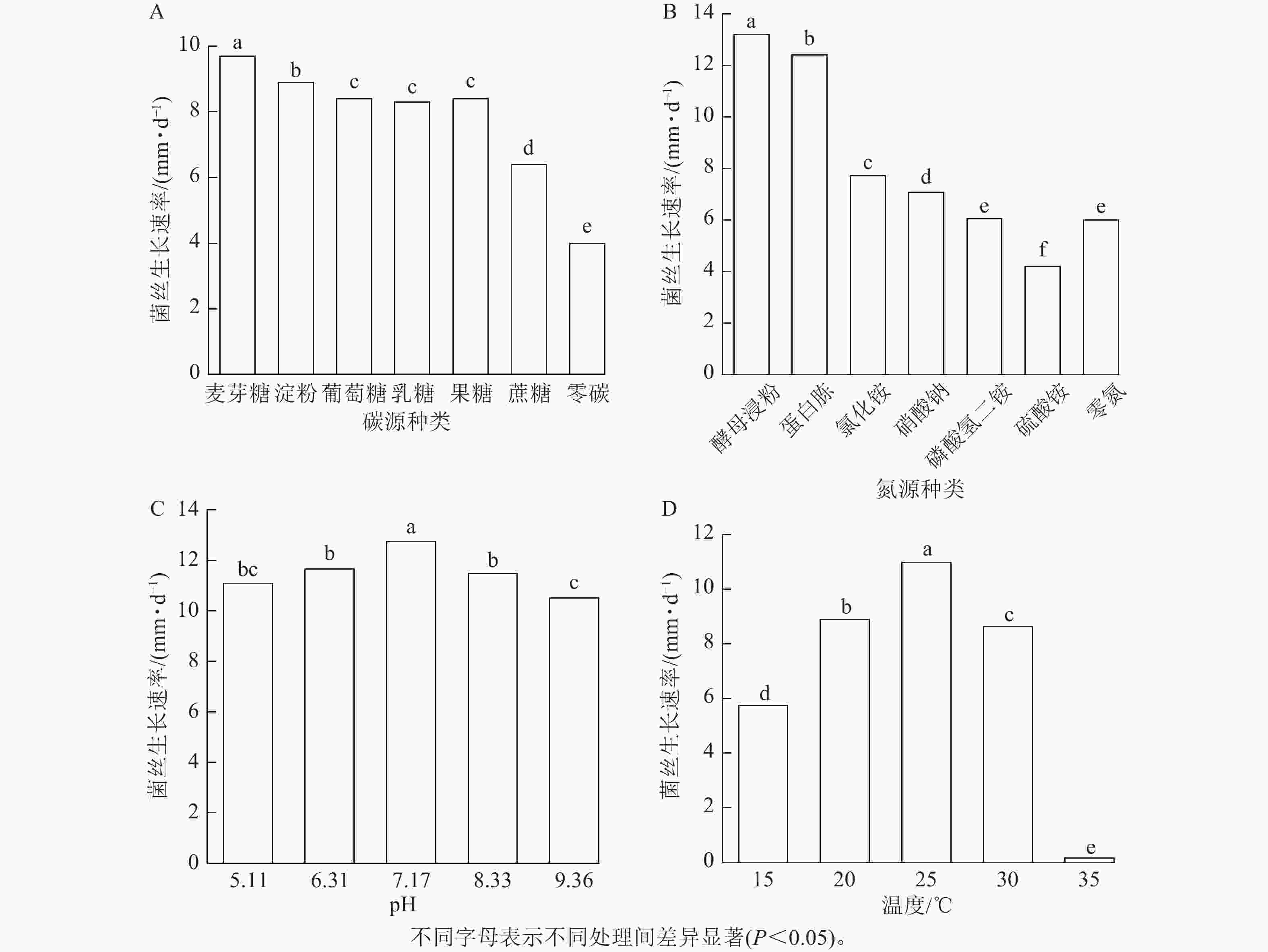 图  5  不同碳源(A)、氮源(B)、pH (C)和温度(D)条件下菌丝生长速率