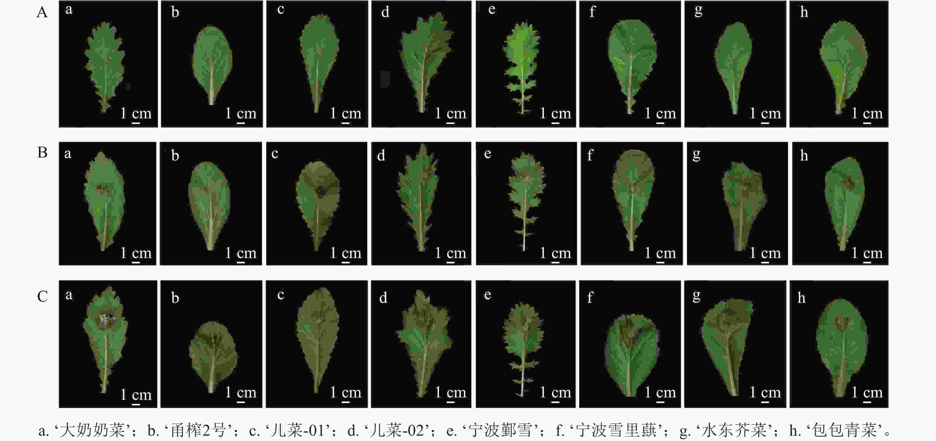 • 表1图1所示:茎用芥菜的植株高度大于叶用芥菜,而叶用芥菜的株幅更大,植株更为健壮。不同品种芥菜的叶片形态存在差异,‘大奶奶菜’和‘甬榨2号’的叶片呈长条形,叶缘锯齿明显;‘儿菜-01’和‘儿菜-02’的叶片锯齿较浅,叶面积较大;‘宁波鄞雪’的叶片为羽状深裂,‘宁波雪里蕻’‘水东芥菜’和‘包包青菜’的叶片均为卵圆形,叶缘锯齿较少。虽然叶用类芥菜的叶片形态较为统一,但不同品种间的叶面积差异仍较为明显。
