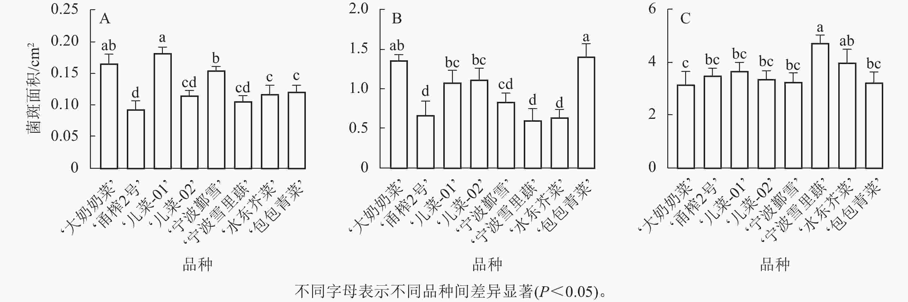 其中,在接种核盘菌12 h时,‘儿菜-01’的菌斑面积最大,‘大奶奶菜’和‘宁波鄞雪’次之,而‘甬榨2号’的菌斑面积最小。‘儿菜-02’‘宁波雪里蕻’‘水东芥菜’和‘包包青菜’的菌斑面积则表现为中间值(图3A)。在接种核盘菌24 h时,‘包包青菜’的菌斑面积增长最为明显,达最大值,除与‘大奶奶菜’以外,与其他品种均差异显著(P<0.05)。‘儿菜-01’和‘儿菜-02’之间无显著差异,‘宁波鄞雪’‘水东芥菜’和‘宁波雪里蕻’的菌斑面积次之,而‘甬榨2号’的菌斑面积仍最小(图3B)。在接种核盘菌36 h时,菌斑面积为3.176~4.758 cm2。此时,‘宁波雪里蕻’的菌斑面积最大,而‘大奶奶菜’的菌斑面积最小,其他品种之间差异不显著(图3C)。因此,8个不同品种的芥菜中,‘甬榨2号’对核盘菌的抗性最强,其次为‘水东芥菜’。