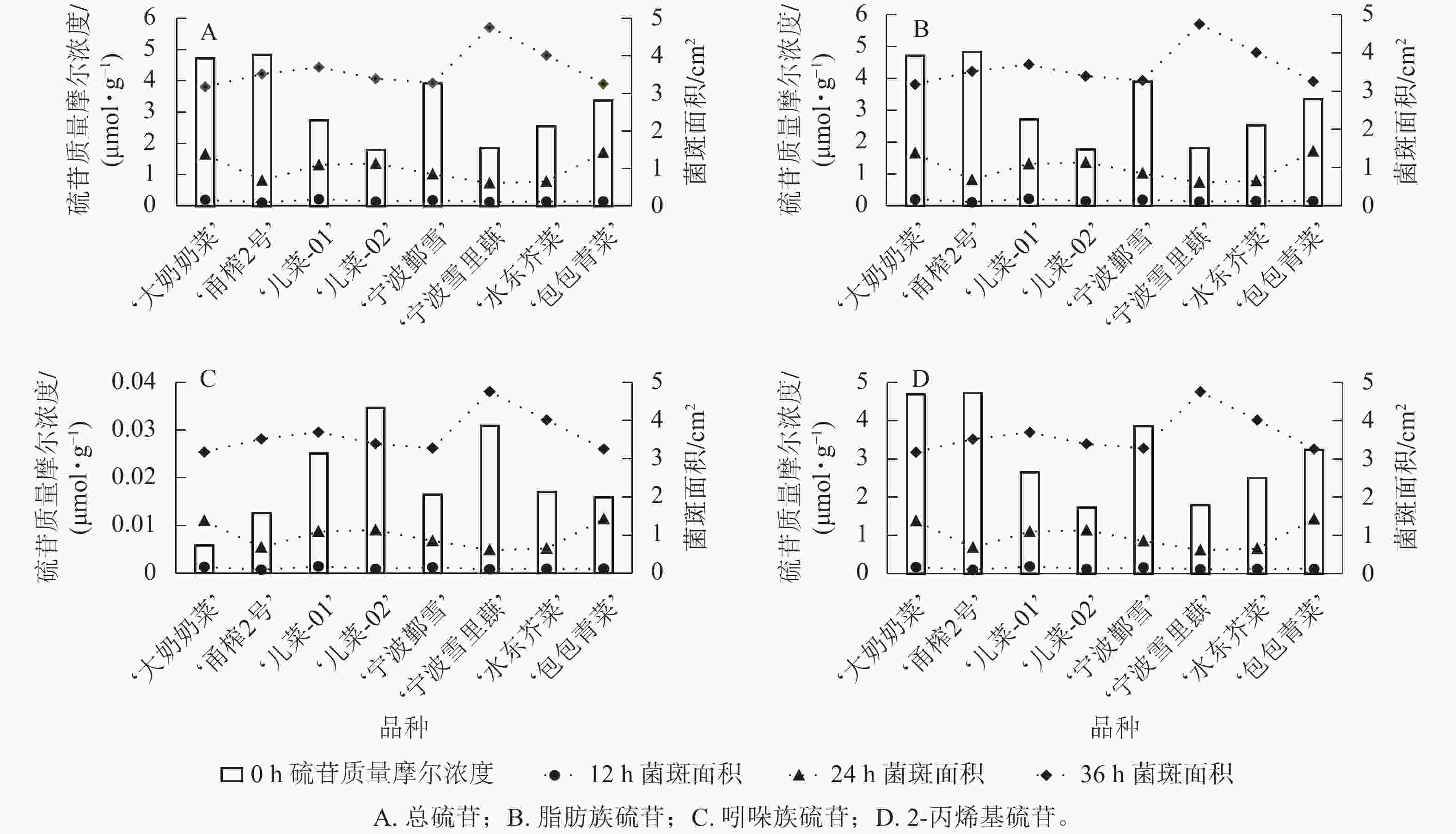 • 摘要:   目的  对8个芥菜Brassica juncea品种叶片硫苷质量摩尔浓度进行分析,旨在探究硫苷质量摩尔浓度及组分对植株抗病性的作用。  方法  分别以4个茎用芥菜B. juncea var. tumida品种‘大奶奶菜’Danainaicai’、‘儿菜-01’‘Ercai-01’、‘儿菜-02’‘Ercai-02’、‘甬榨2号’‘Yongzha No. 2’和4个叶用芥菜B. juncea var. rugosa品种‘宁波鄞雪’‘Ningboyinxue’、‘宁波雪里蕻’‘Ningboxuelihong’、‘水东芥菜’‘Shuidongjiecai’、‘包包青菜’‘Baobaoqingcai’为试材,测定芥菜叶片硫苷质量摩尔浓度,并通过活体接种核盘菌Sclerotinia sclerotiorum测量菌斑面积进行抗病性分析。  结果  不同芥菜品种叶片总硫苷质量摩尔浓度存在差异,总硫苷质量摩尔浓度为1.851~4.844 µmol·g−1,脂肪族硫苷质量摩尔浓度为1.766~4.831 µmol·g−1,两者均为‘甬榨2号’最高,‘儿菜-02’最低;吲哚族硫苷质量摩尔浓度为0.006~0.035 µmol·g−1,‘儿菜-02’最高,‘大奶奶菜’最低;‘水东芥菜’各组分硫苷质量摩尔浓度均处于中间型。2-丙烯基硫苷在所有品种中占总硫苷质量摩尔浓度的95%以上。在12 h时,‘儿菜-01’菌斑面积最大,在24 h时,‘包包青菜’菌斑面积最大,‘甬榨2号’菌斑面积在2个时间点均为最小;在36 h时,‘宁波雪里蕻’菌斑面积最大,‘大奶奶菜’最小(P<0.05)。  结论  芥菜对病原菌的抗性与硫苷总量、组分质量摩尔浓度及其比例密切相关,茎用芥菜总硫苷质量摩尔浓度高于叶用芥菜,‘甬榨2号’对核盘菌的抗性最强,其次为‘水东芥菜’。图4表2参29