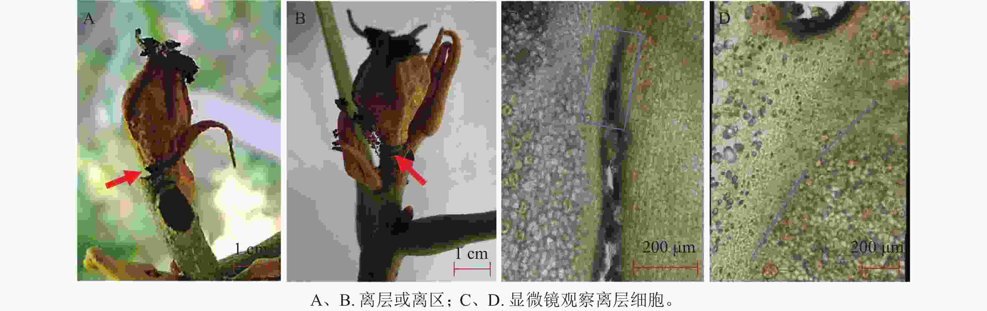 • 通过系统解剖学追踪,发现山核桃离层主要分布于2类微解剖位点:果柄-枝条连接处和果实-果柄过渡区(图2)。在山核桃果实的脱落过程中,果柄与枝条、果实与枝条的连结处为新生的组织,质地柔软,牢固性差,表明落果的形成可能与组织结构、细胞紧密程度相关,影响离层的形成。