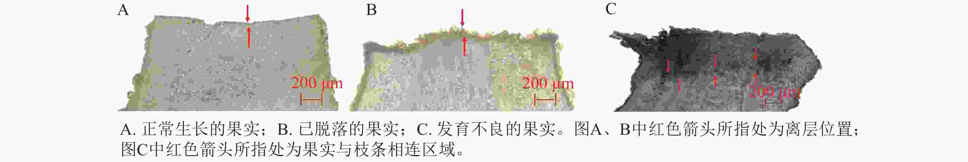 • 采集正常果与自然脱落果的果柄离区组织(长度为5 mm),立即浸入预冷的质量分数为2.5%戊二醛(0.1 mol·L−1 PBS缓冲液,pH 7.2)进行渗透固定(2 h),再用体积分数为75%乙醇浸泡洗脱2次。