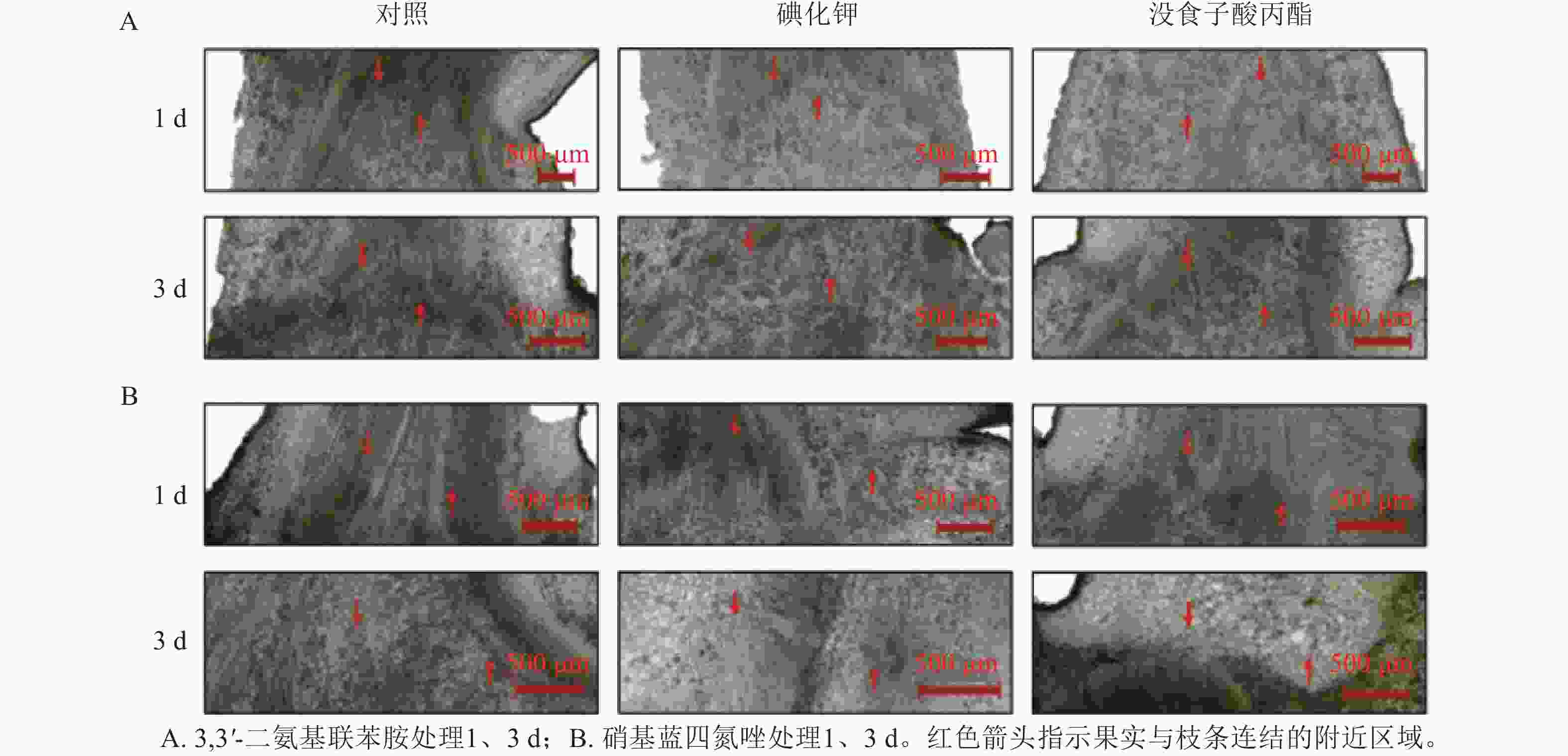 • 用3.0 mmol·L−1碘化钾和0.5 mmol·L−1没食子酸丙酯对正常生长的山核桃果实分别处理1、3 d,采集后同一时间进行组织固定和3,3'-二氨基联苯胺、硝基蓝四氮唑染色,观察切片显色差异(图4)。对比果实与枝条连结的组织切片染色情况。结果表明:正常生长的山核桃果实经过碘化钾、没食子酸丙酯的处理后,比对照处理显色更浅,体内活性氧水平更低,通过3,3'-二氨基联苯胺、硝基蓝四氮唑染色,碘化钾、没食子酸丙酯对活性氧的清除效果得到进一步验证。