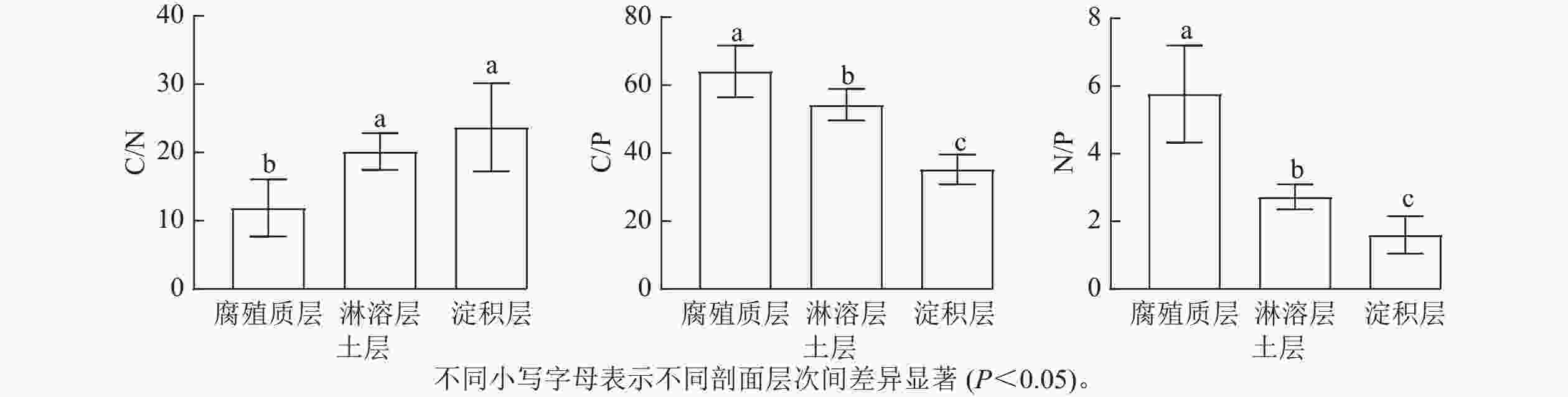 在森林生态系统中,土壤碳氮磷作为影响树木生长的重要因素,也是研究树木生长规律与土壤生境相关性的重要指标[13],因此,研究碳氮磷在土层间的循环特征,有助于揭示土壤生境变化对树木生长的影响与及其内在规律。当前大多数研究主要按照土壤深度进行分层取样,进而阐明碳氮磷等元素在土壤中的垂直梯度格局。然而,不同类型森林因立地条件[14]、树种组成[15]等存在较大差别,导致其林下土壤剖面特征也表现出较大不同。基于土壤深度取样是按照固定深度区间进行的机械性划分,单纯地按照深度进行的取样方法无法体现森林土壤发育过程中土壤碳氮磷在土层间的循环特征。而基于土壤剖面层次取样则是按照自然发生层进行的功能划分,在阐明土壤剖面发育过程中碳氮磷循环特征具有较强的优越性,但当前针对土壤剖面层次的碳氮磷化学计量特征分析较少。