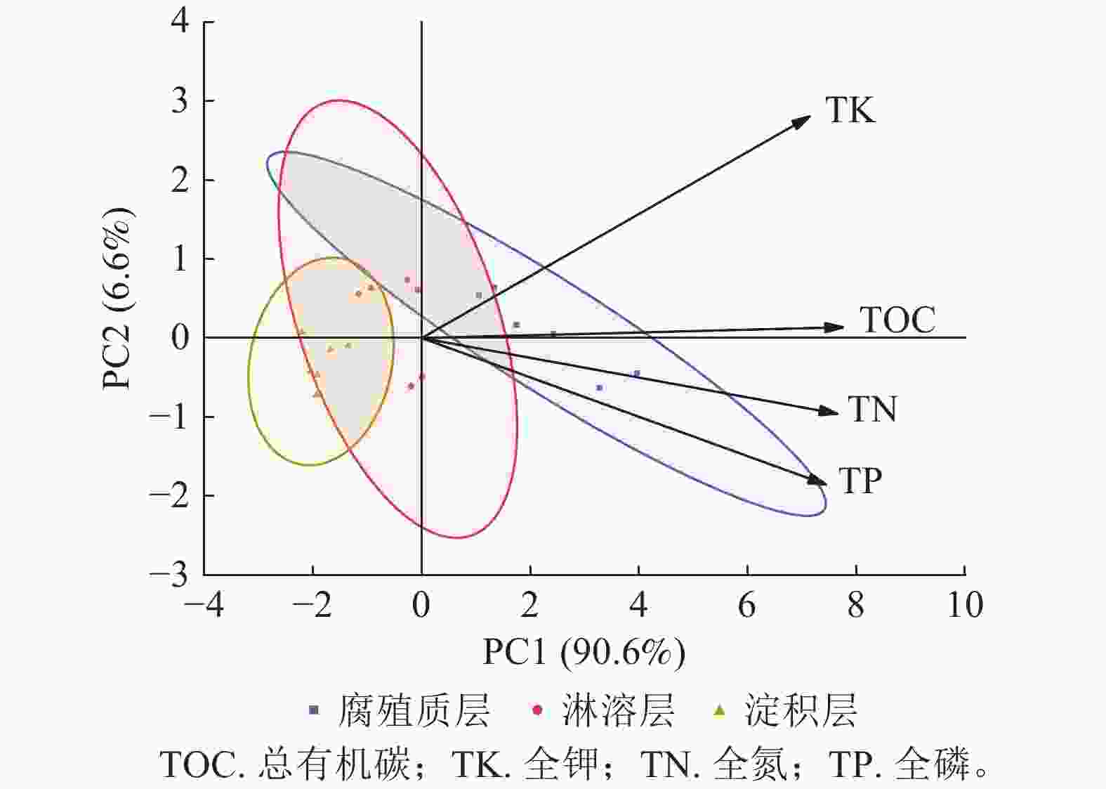 • 采用主成分分析(PCA)对土壤总有机碳、全氮、全钾、全磷进行进一步分析。提取的第1主成分(PC1)、第2主成分(PC2)的方差贡献率分别为90.6%、6.6%,累计方差贡献率为97.2%,3个土层数据均呈正向分布。图4显示:腐殖质层的土壤元素与其他2个土层均具有显著差异(P<0.05),而淋溶层与其他2个土层置信区间均有部分重合,反映其与腐殖质层、淀积层土壤因子各自具有一定的相似性;总有机碳、全氮、全钾、全磷之间均呈线性正相关。根据各变量在PC1轴上的投影得出:有机碳对PC1的影响最大,全氮次之。