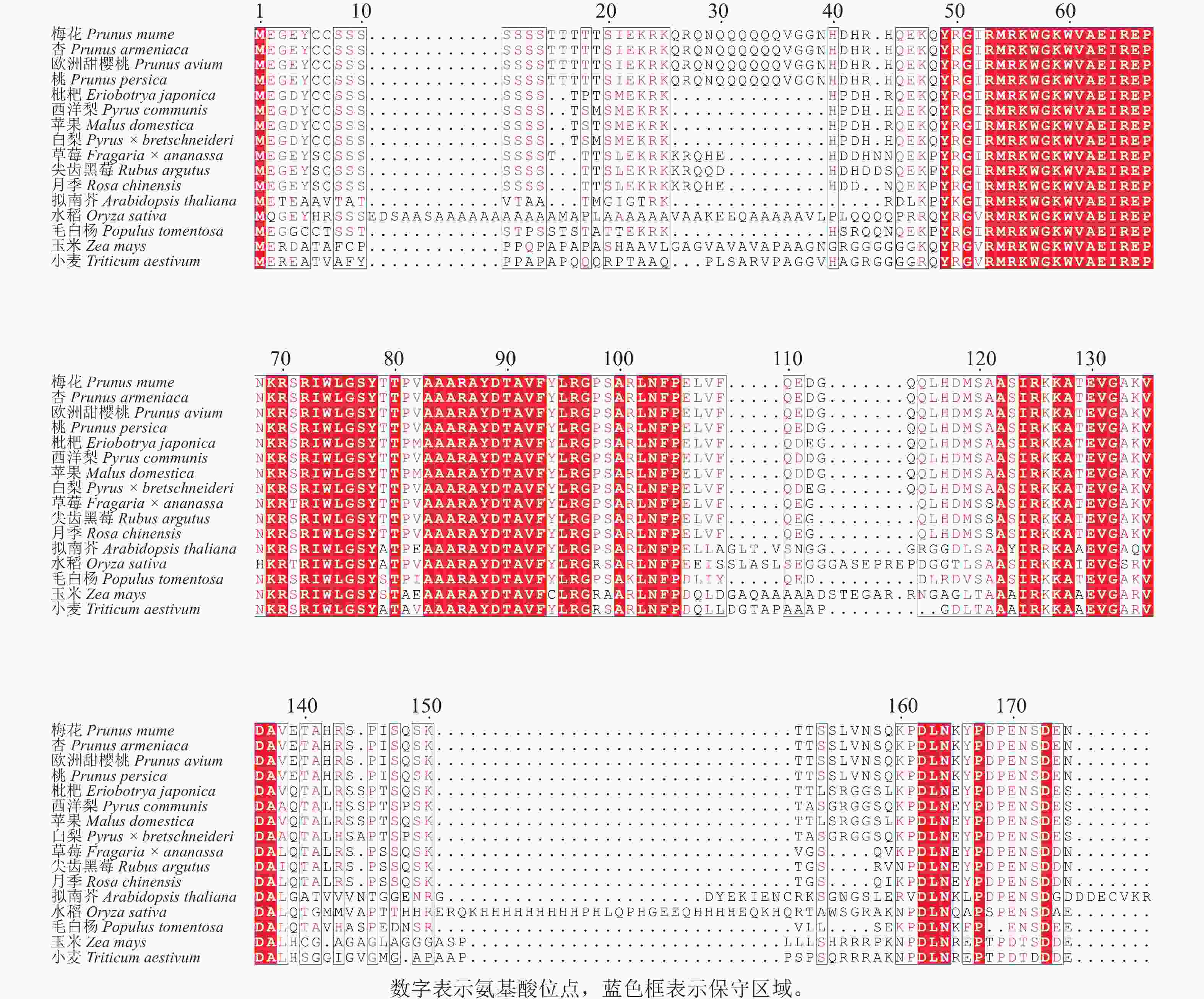 为探究PmERF011的进化关系及保守性,通过NCBI-BLAST对其与近缘物种的ERF家族蛋白进行同源性分析,涵盖杏Prunus armeniaca、桃Prunus persica、草莓Fragaria × ananassa、毛白杨Populus trichocarpa、欧洲甜樱桃Prunus avium、枇杷Eriobotrya japonica、西洋梨Pyrus communis、苹果Malus domestica、白梨Pyrus × bretschneideri、尖齿黑莓Rubus argutus、月季Rosa chinensis、水稻、拟南芥、玉米Zea mays、小麦Triticum aestivum共15个物种。同源序列比对结果显示:梅花PmERF011与桃、杏、欧洲甜樱桃的ERF011蛋白序列完全相同,表明蔷薇科李属内该基因高度保守,与拟南芥、水稻、草莓、毛白杨、水稻、枇杷、西洋梨、苹果、白梨、尖齿黑莓、月季、玉米、小麦蛋白序列的AP2/ERF结构域同源性较高(图3)。