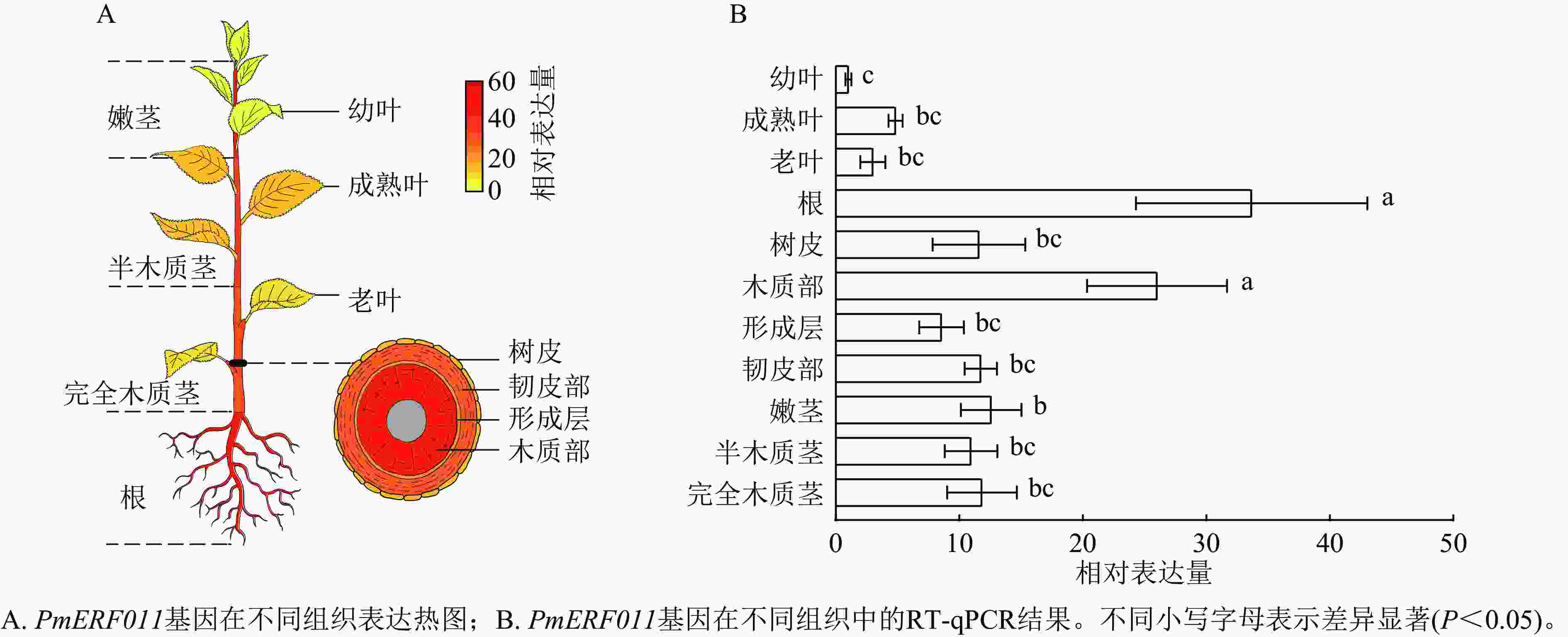 转录组数据表达热图和RT-qPCR检测结果显示:PmERF011基因在幼叶、成熟叶、老叶、根、树皮、木质部、形成层、韧皮部、嫩茎、半木质茎、完全木质茎11种组织中均有表达。值得注意的是,PmERF011的表达水平存在显著的组织差异:在根和茎木质部中表达量最高,在嫩茎和茎韧皮部表达量次之,而在叶片中表达量最低(图5)。这种表达模式说明PmERF011主要参与根部发育和茎次生生长相关的调控过程。