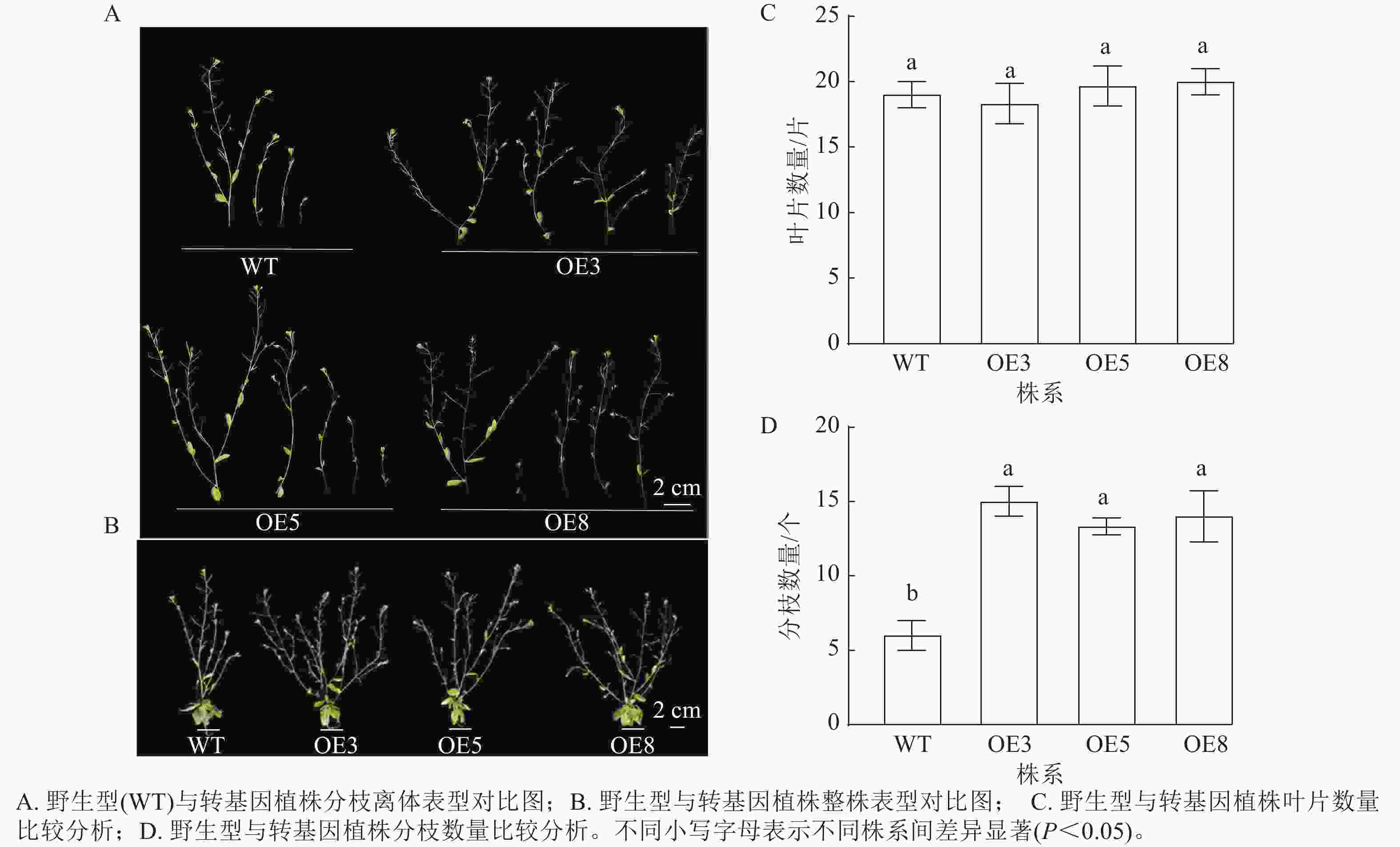 选择表达量高的T2代3个株系(OE3、OE5和OE8)进行播种并观察表型。拟南芥幼苗移栽40 d后,野生型和过表达植株均进入花期。对比野生型和PmERF011转基因植株的表型性状,发现转基因植株的分枝数量有所增加(图7 A、B)。统计结果表明:野生型和转基因株系拟南芥的叶片数量相近,无显著差异(图7 C);野生型拟南芥的平均分枝数为6.00个,3个PmERF011过表达株系的平均分枝数量分别为15.00、13.33、14.00个,与野生型相比差异显著(P<0.05,图7 D)。