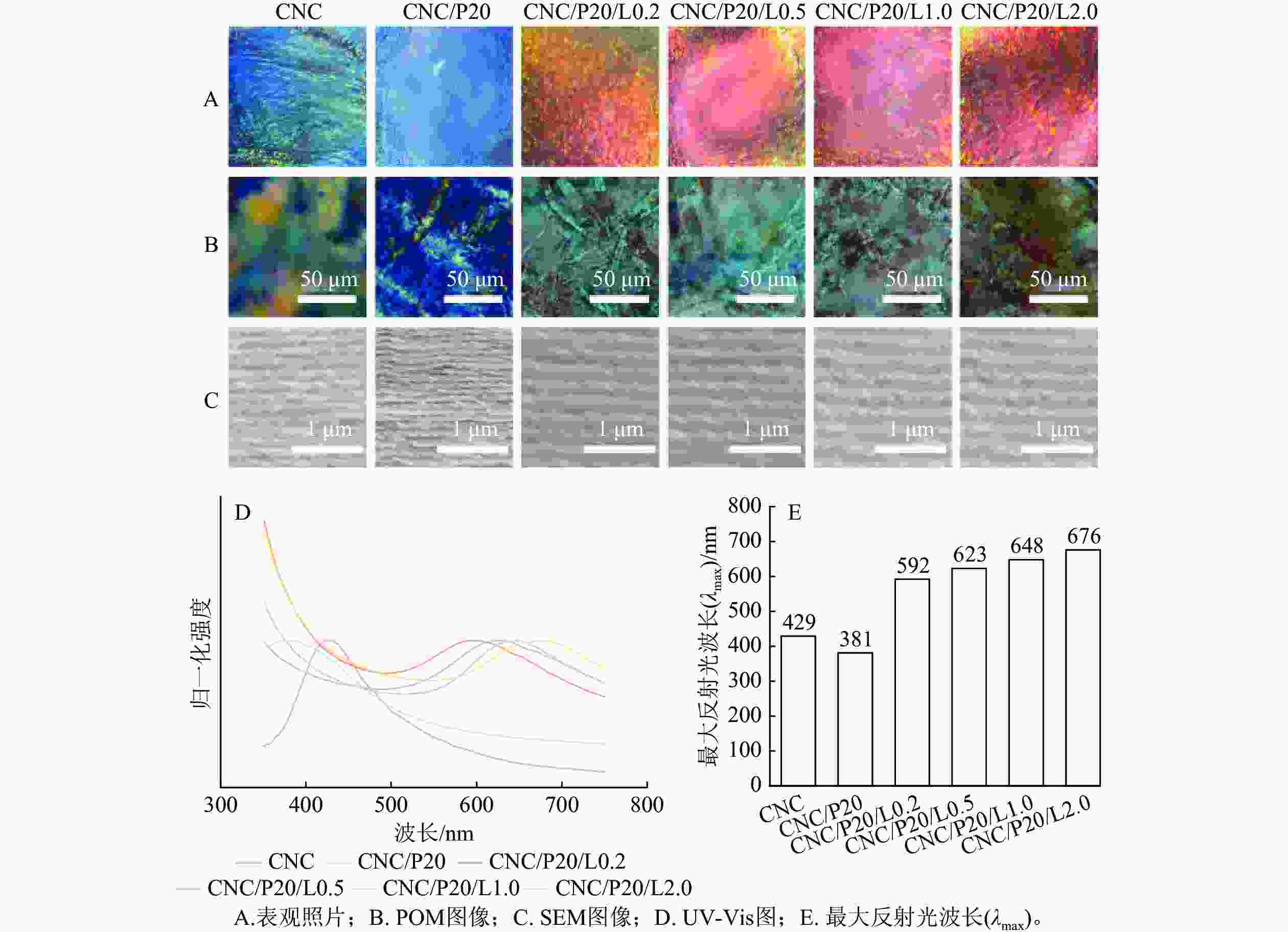由图2A可知:所有薄膜都具有光滑的表面和均匀的结构色,其中,纯CNC薄膜为蓝绿色,CNC/P20薄膜为深蓝色,而CNC/PCNF/LNPs薄膜则整体表现为红色,随着LNPs质量分数增加,薄膜的颜色逐渐转变为橙黄色、橙红色和深红色,表明LNPs的加入可以使薄膜的结构色发生红移。由图2B可知:所有薄膜都具有长程有序且呈周期性排列的指纹织构,并表现出特殊的双折射特性。由图2C可知:所有薄膜都具有周期性层状结构,说明加入LNPs未破坏CNC的手性向列相液晶结构,且随着LNPs质量分数的增加,CNC/PCNF/LNPs薄膜的层状结构逐渐变得疏松。由图2D~E可知:纯CNC薄膜的λmax为429 nm,CNC/P20薄膜的λmax为381 nm,而CNC/PCNF/LNPs薄膜的λmax随着LNPs质量分数的增加,依次为592、623、648、676 nm,说明发生了红移。这与表观照片所反映的结果一致。这是由于在CNC自组装过程中,LNPs会插入到CNC的层与层之间,导致CNC的螺距增大,使薄膜的结构色和λmax都产生了红移[21]。对图2C的螺距尺寸进行测量和统计,可以得出CNC、CNC/P20、CNC/P20/L0.2、CNC/P20/L0.5、CNC/P20/L1.0和CNC/P20/L2.0薄膜螺距(P)的测量值分别为284、249、373、395、420和437 nm。这与表观照片和UV-Vis所得到的结果一致。以CNC/P20/L2.0薄膜为例,CNC的n为1.52,P为437 nm,θ为90 °,因此可以得出λmax(计算值)=664.2 nm,这与λmax(测量值)=676.0 nm是吻合的。