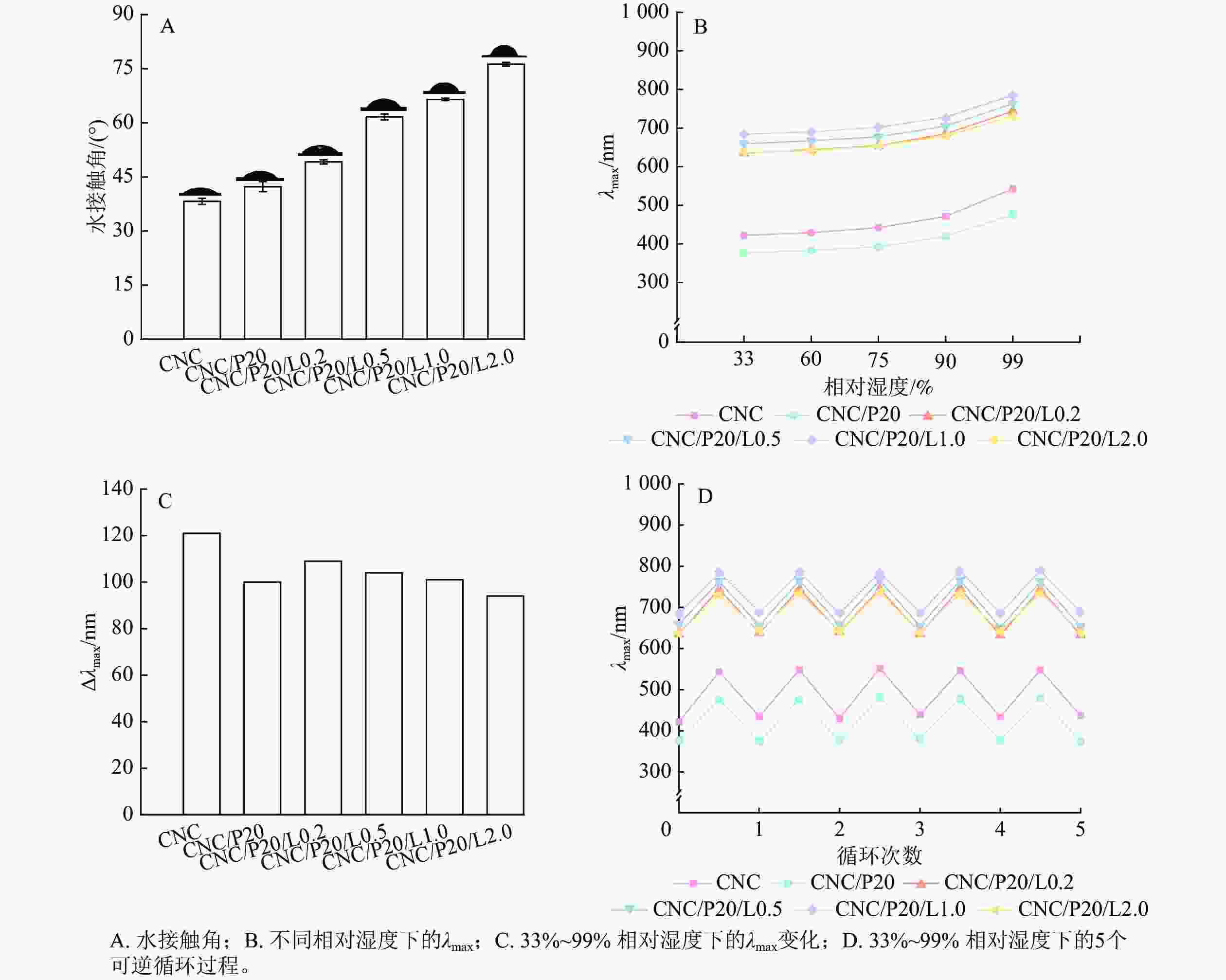 由图4A可知:纯CNC薄膜的水接触角为39.0°,CNC/P20薄膜的水接触角为40.8°,CNC/P20/L0.2、CNC/P20/L0.5、CNC/P20/L1.0和CNC/P20/L2.0薄膜的水接触角分别为49.0°、61.5°、66.1°和76.1°。这是因为CNC表面含有大量的羟基,所以表现出显著的亲水性;而木质素中含有疏水官能团(如苯基和醚键),可以减少木质素与水的相互作用,增大表面张力,使薄膜的疏水性得到提升[23]。由图4B可知:随着相对湿度的增加,薄膜的λmax逐渐增大,发生红移。这是由于水分子能够渗透进入CNC/PCNF/LNPs薄膜当中,导致薄膜的螺距增大,从而产生红移。这表明:该薄膜在具备一定疏水性的同时,仍能表现出良好的湿度响应性。由图4C可知:随着LNPs质量分数的增加,薄膜在33%~99%相对湿度下λmax的变化值(Δλmax)逐渐减小,这可能是LNPs的高疏水性使水分子在CNC层与层之间的运输速度降低所致[21]。此外,在99%相对湿度下,纯CNC和CNC/P20薄膜的湿度响应时间小于40 s,CNC/P20/L0.2薄膜的湿度响应时间为54 s,而CNC/P20/L0.5、CNC/P20/L1.0和CNC/P20/L2.0薄膜的湿度响应时间均大于2 min。这些结果表明:加入LNPs会降低薄膜的湿度敏感性。由图4D可知:随着相对湿度的增加,薄膜的λmax逐渐增大,发生了红移;随着相对湿度的降低,薄膜的λmax逐渐减小,并且最终恢复到初始状态。这是因为当相对湿度增加时,水汽进入到薄膜当中,而在相对湿度降低时,进入到薄膜中的水分会被重新蒸发出来。经过5个周期的吸湿-解湿循环,薄膜仍能够保持完整,且λmax的变化率小于2%,说明CNC/PCNF/LNPs薄膜的湿度响应性较为稳定。