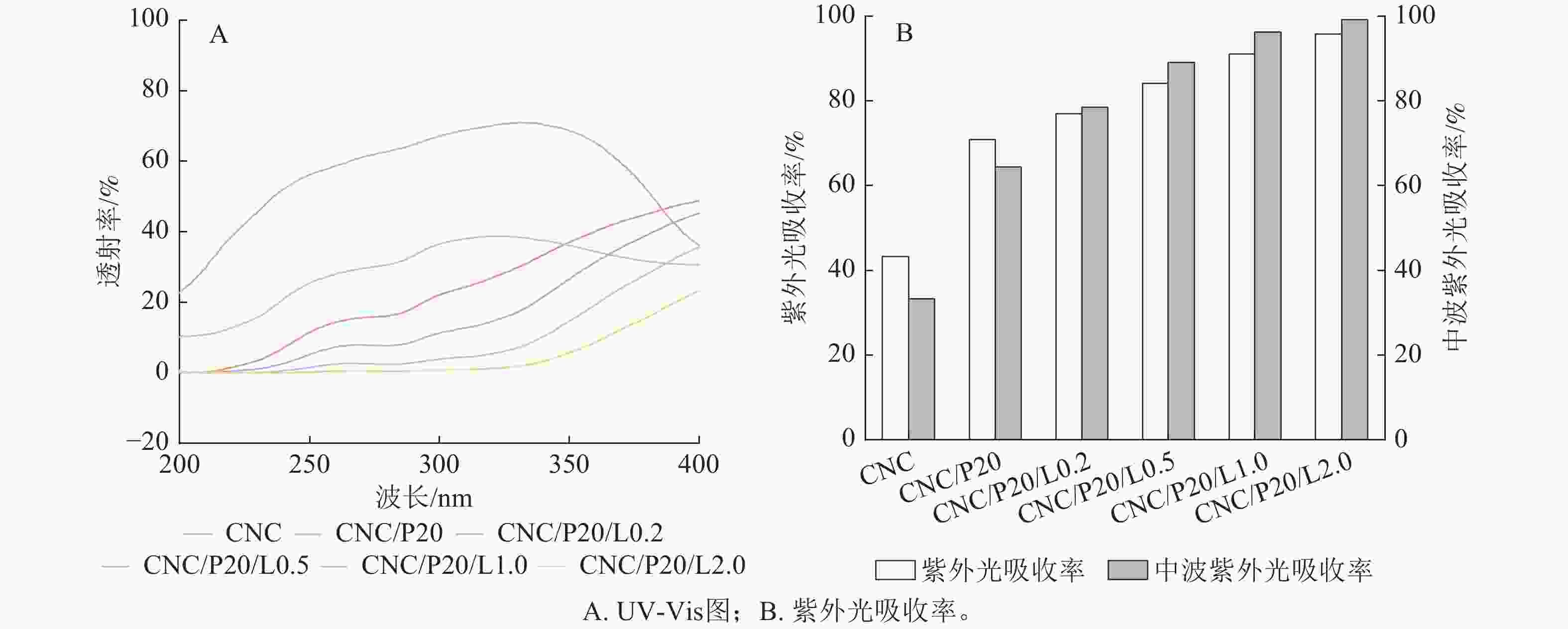 图6A为不同配比CNC/PCNF/LNPs薄膜在紫外光区(UV区,200~400 nm)的UV-Vis图。可见纯CNC和CNC/P20薄膜在紫外光区的透过率很高,紫外阻隔性能差;随着LNPs质量分数的增加,CNC/PCNF/LNPs薄膜在紫外光区的透过率显著降低,说明LNPs的加入可以提高薄膜的紫外阻隔性能。中波紫外光区(UVB区,280~320 nm)的紫外线是导致人类DNA损害和皮肤癌的主要原因。因此,选取薄膜在紫外光和中波紫外光区的紫外光吸收率来评估其紫外阻隔性能(图6B)。可以看出:纯CNC薄膜在紫外光和中波紫外光区的紫外光吸收率为43.2%和33.2%;CNC/PCNF/LNPs薄膜在紫外光和中波紫外光区的紫外光吸收率随着LNPs质量分数的增加逐渐增大,其中CNC/P20/L2.0薄膜的可达95.8%和99.2%。这是由于LNPs分子中的官能团,如苯基、双键和羰基等,可以吸收紫外光。另外,苯基还可以通过发生中和反应,抵消掉紫外光引发的自由基,从而达到抗紫外的效果[21, 25−26]。