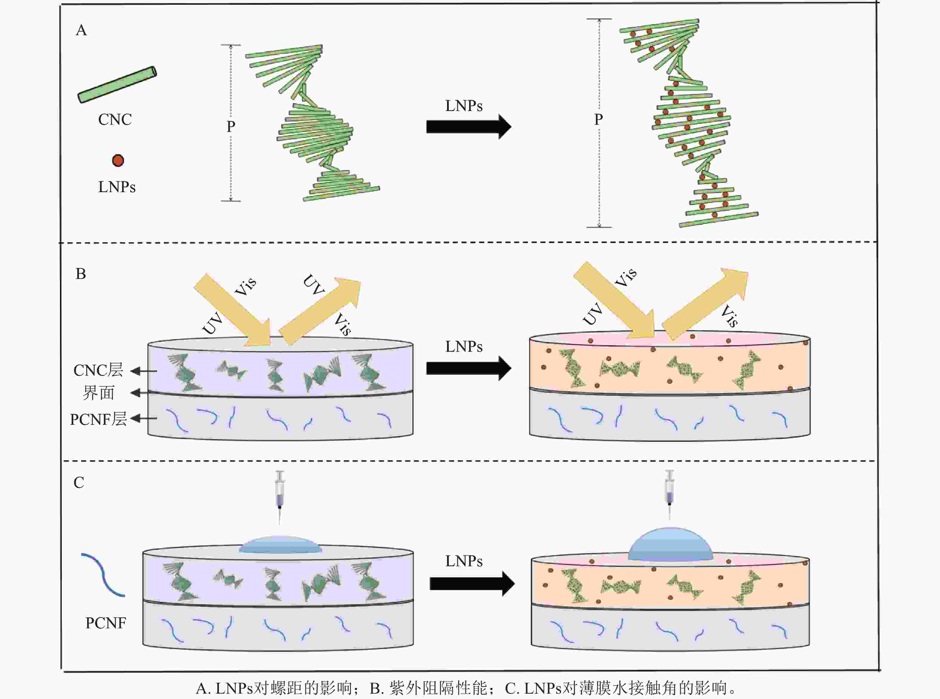 基于上述研究结果,总结了CNC/PCNF/LNPs的相互作用机理(图7)。PCNF是提升CNC/PCNF/LNPs复合薄膜力学性能的关键因素,其表面的磷酸基团和羟基能够与CNC上的羟基形成致密的氢键网络,该网络可有效分散载荷,增强CNC的耗散能力,从而提高CNC薄膜的力学拉伸性能和韧性[12]。由图7A可知:因为LNPs的尺寸较小,所以在CNC自组装时能够很容易地插入到CNC的层与层之间,导致CNC薄膜的螺距增大。根据布拉格衍射,螺距的增大会引起结构色和λmax的显著红移。因此,LNPs的加入会影响复合薄膜的形貌结构和光学性质。由图7B~C可知:LNPs 的加入使 CNC 薄膜具备了紫外阻隔性和疏水性,其原因是 LNPs 分子中含有苯基、醚键和羰基等官能团。这些官能团一方面可以通过空间位阻效应和降低表面能,降低复合薄膜与水的相互作用,另一方面可以通过电子跃迁吸收紫外光。因此,向双层的CNC/PCNF薄膜体系中引入LNPs,可成功制备出具有可调的结构色、紫外阻隔性和疏水性的CNC/PCNF/LNPs复合薄膜。