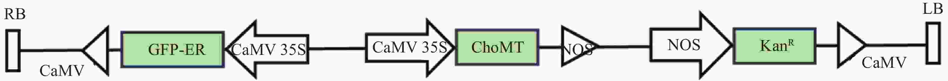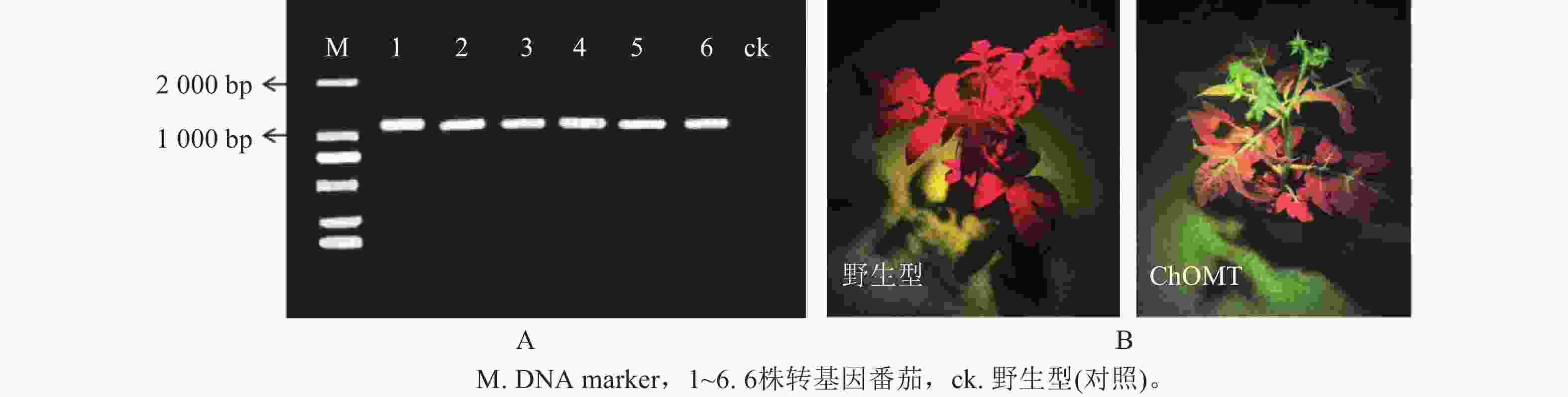 ①种子灭菌。在超净工作台中,将称量好的番茄种子倒入灭过菌的100 mL锥形瓶中,加体积分数为75%的乙醇,摇晃30 s,用无菌水洗2遍,质量分数为2.0%次氯酸钠溶液浸泡,在摇床上摇1 h,用无菌水洗5遍,放4 ℃冰箱过夜。②外植体的获取。将灭菌后的种子在超净工作台上播到1/2MS0培养基中,播种5 d后,番茄2片子叶完全展开且没有真叶长出,即可剪下子叶,置于MS0-AS溶液的玻璃皿中,待所有子叶剪完后,转移到铺有滤纸的A1共培养培养基[(MS0 + 2.0 mg·L−1ZT + 0.1 mg·L−1吲哚乙酸(IAA)]上,叶面朝上,锡纸包裹后置于黑暗条件下预培养2 d。③农杆菌侵染。将携带目的基因的农杆菌GV3101(pCAMBIA1380-ChOMT)震荡培养过夜,4 000 r·min−1离心10 min,收集菌体,用MS0-AS溶液重悬至D(600)=0.3,与上述预培养的外植体共孵育15 min,叶背朝上转接到A1共培养培养基上,黑暗过夜共培养。④脱分化与再分化。将A1中的叶片转接到A2愈伤诱导培养基[MS0 +2.0 mg·L−1玉米素(ZT) + 0.1 mg·L−1IAA + 100.0 mg·L−1卡那霉素 +300.0 mg·L−1 替门汀(Timentin)]中,叶面朝上培养50 d,待愈伤长出后,转移至A3芽诱导培养基(MS0+1.0 mg·L−1ZT + 0.1 mg·L−1IAA + 50.0 mg·L−1卡那霉素+ 50.0 mg·L−1替门汀)中,在A3培养基中培养30 d左右,待小苗长到5 cm,转移到A4根诱导培养基(1/2MS0 + 0.3 mg·L−1IAA + 30.0 mg·L−1卡那霉素 + 150.0 mg·L−1替门汀)中进行生根培养,10 d左右即可生根,进行土壤移栽。
