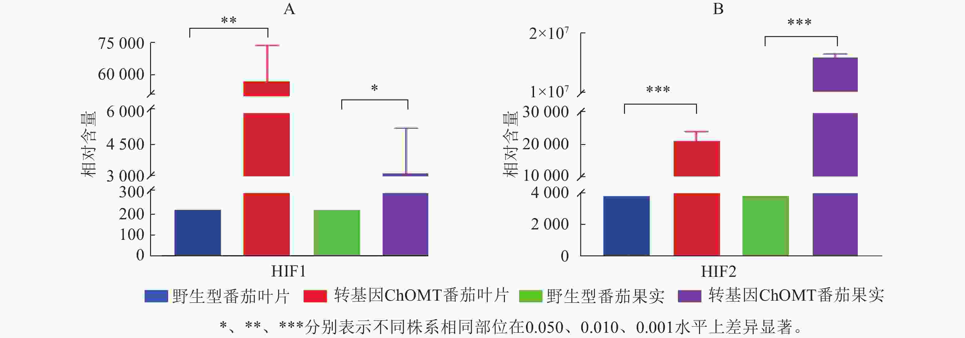 根据代谢物保留时间与峰型的信息,并对高异黄酮HIF1和HIF2检测到的色谱峰进行校正,进行相对含量测定。高异黄酮HIF1和HIF2在番茄野生株系中相对含量极低,在ChOMT转基因植株中相对含量均显著升高。其中,HIF1在转基因番茄叶片中的相对含量为57 019,比野生型叶片中的相对含量(220)增加了260倍,转基因番茄叶片与果实中的HIF1都显著高于野生型(P<0.05,图6A)。HIF2在转基因番茄果实中的相对含量为15 849 985,对比野生型的相对含量(3 849)更是提高了4 000余倍,转基因番茄叶片与果实中的HIF2都极显著高于野生型(P<0.001,图6B)。上述研究结果充分证实了紫花苜蓿ChOMT基因的导入,成功构建了高异黄酮营养强化番茄。