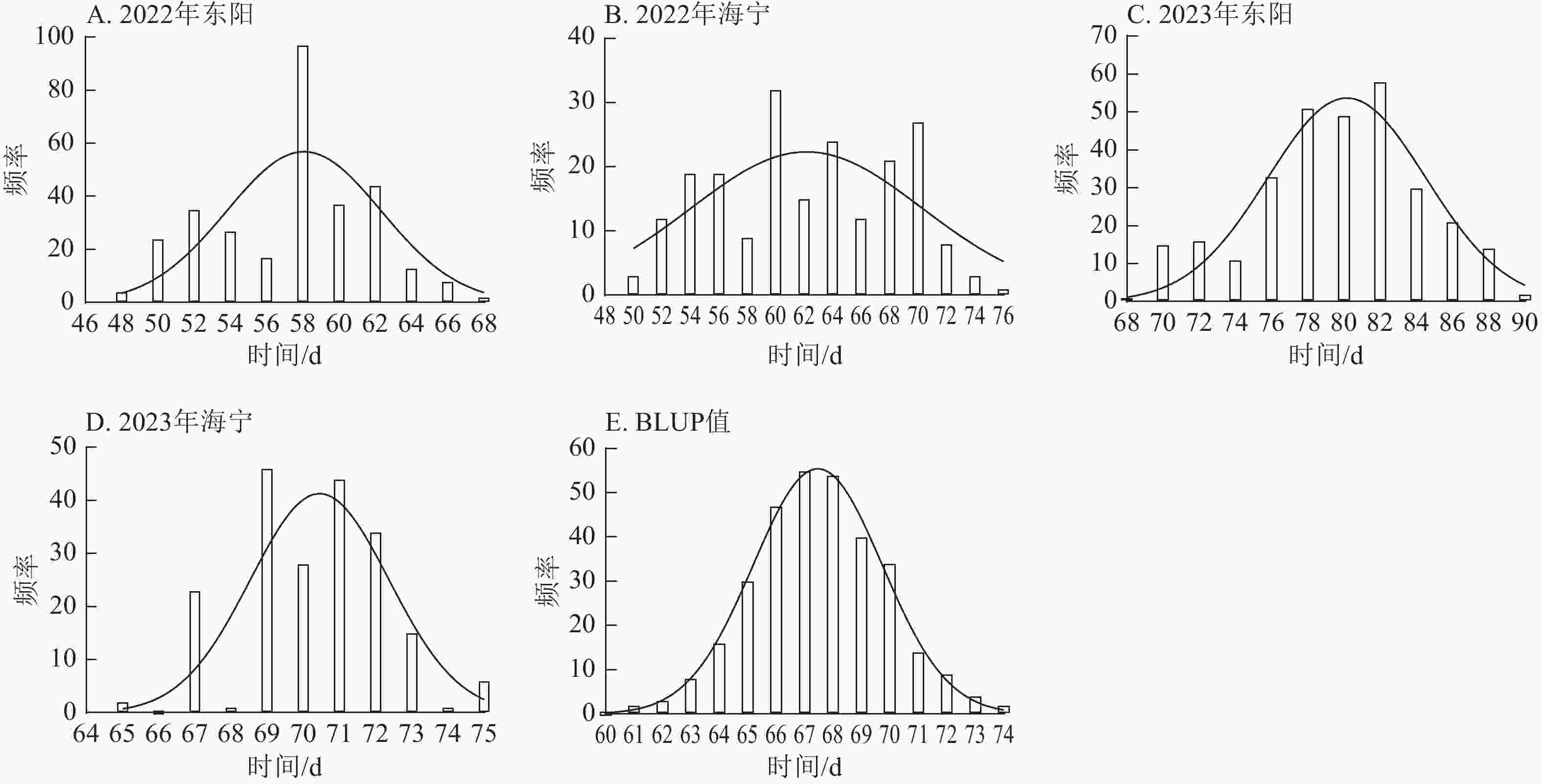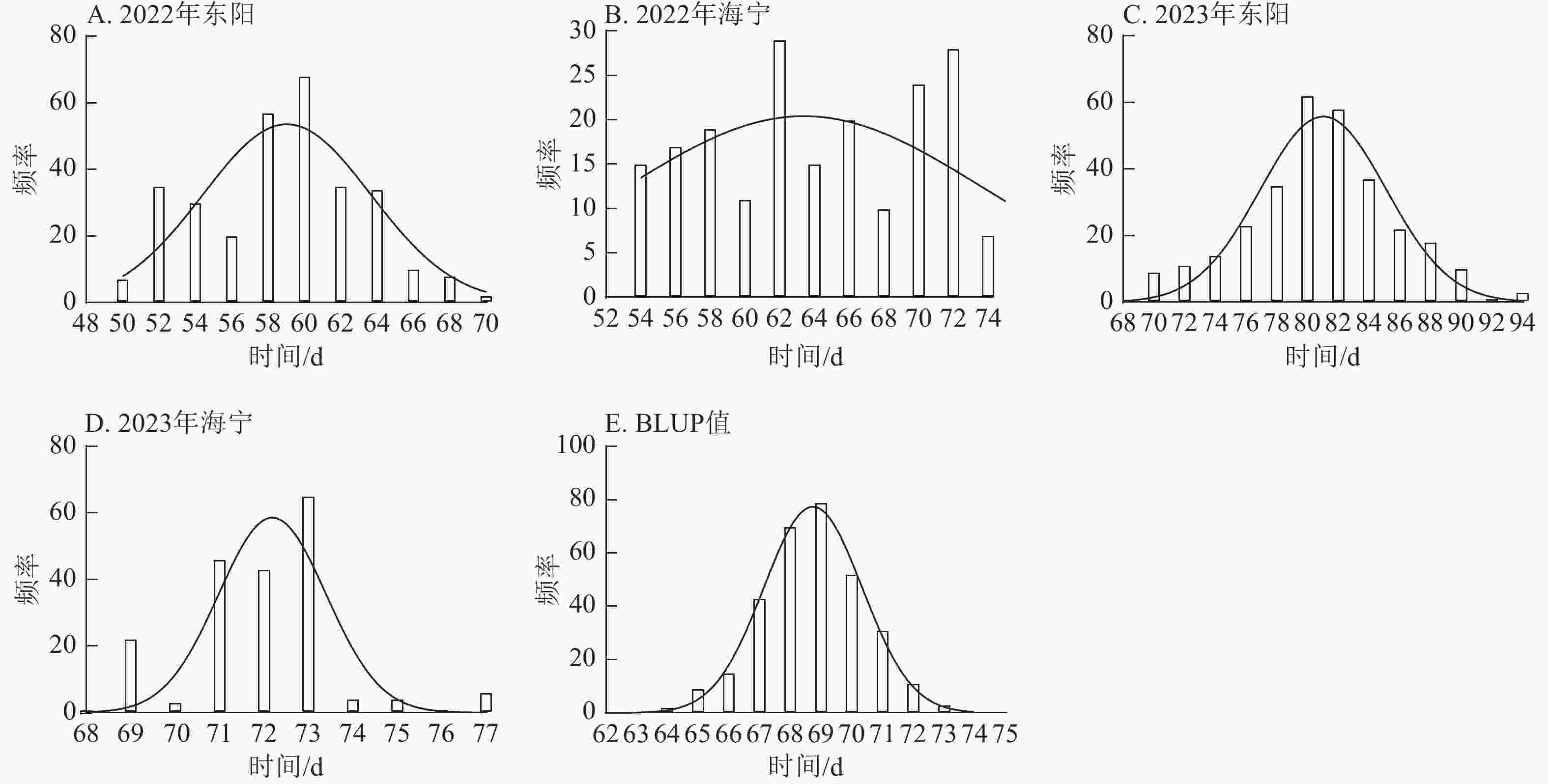 • 采用Excel 2016和SPSS对不同环境下的玉米生育期表型数据进行统计分析。首先剔除异常值,随后计算最大值、最小值、平均值、标准差及变异系数,绘制群体频率分布及描述性图表,并对玉米生育期性状进行方差分析。利用R语言4.3.3分析群体生育期最佳线性无偏预测(best linear unbiased prediction,BLUP)。BLUP可整合多环境表型数据,剔除环境干扰效应,获得个体稳定遗传的表型值。