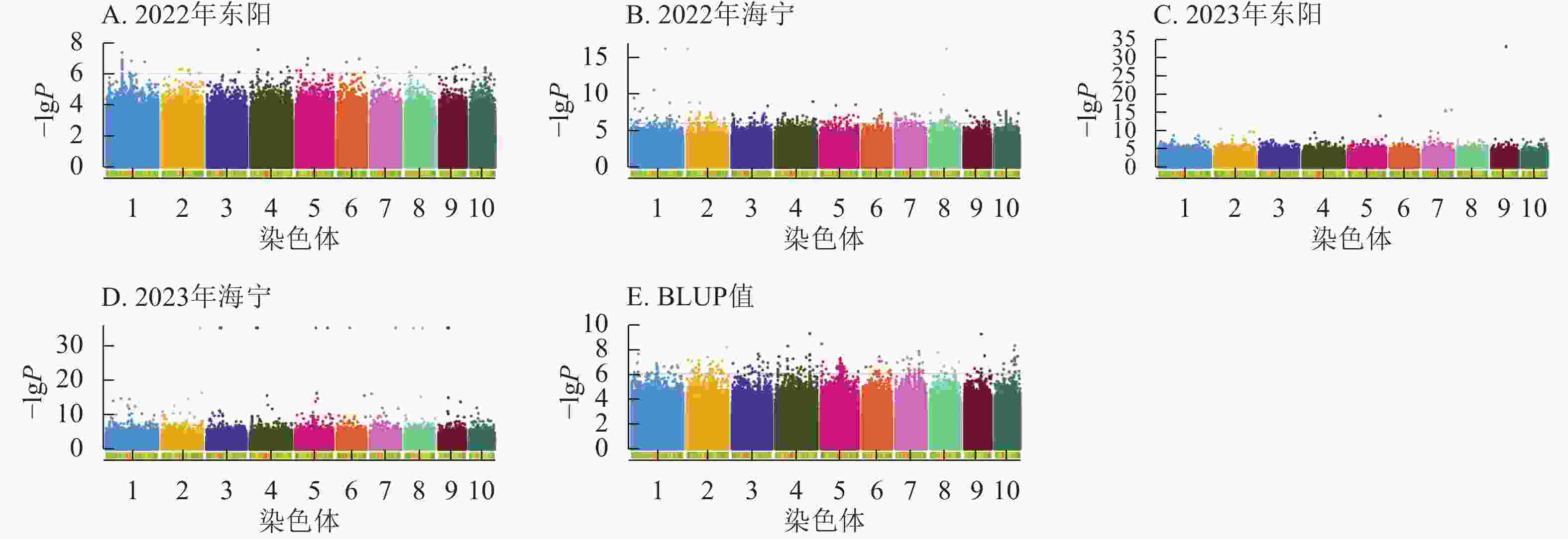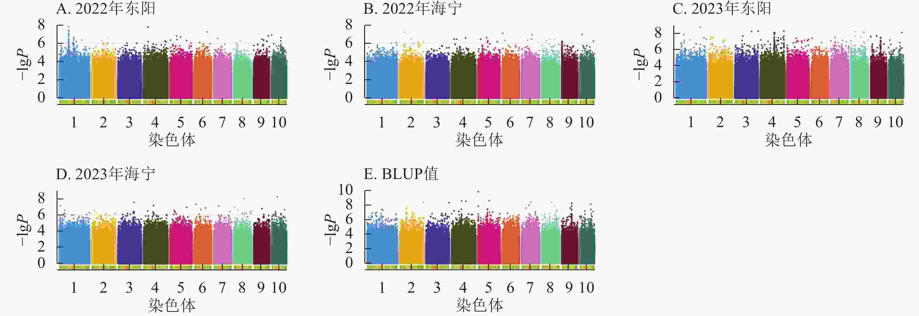 图  6  吐丝期性状在多试点的显著关联SNP曼哈顿图