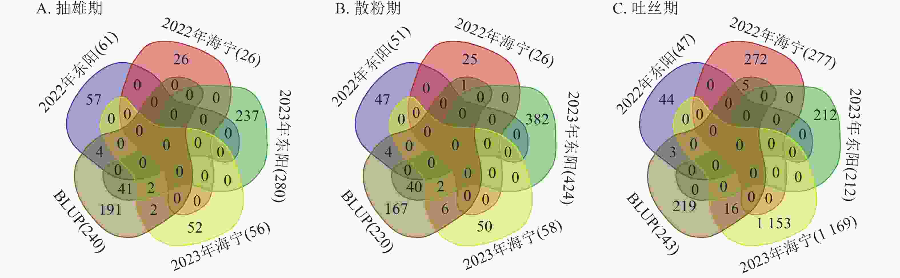 图6显示:2022年东阳、海宁分别检测到47、277个吐丝期性状显著位点,平均表型变异解释率为7.79%、8.39%;2023年东阳、海宁分别检测到212、1 169个显著位点,平均表型变异解释率为8.54%、9.13%;基于BLUP值分析共检测到243个显著位点,平均表型变异解释率为7.95%。