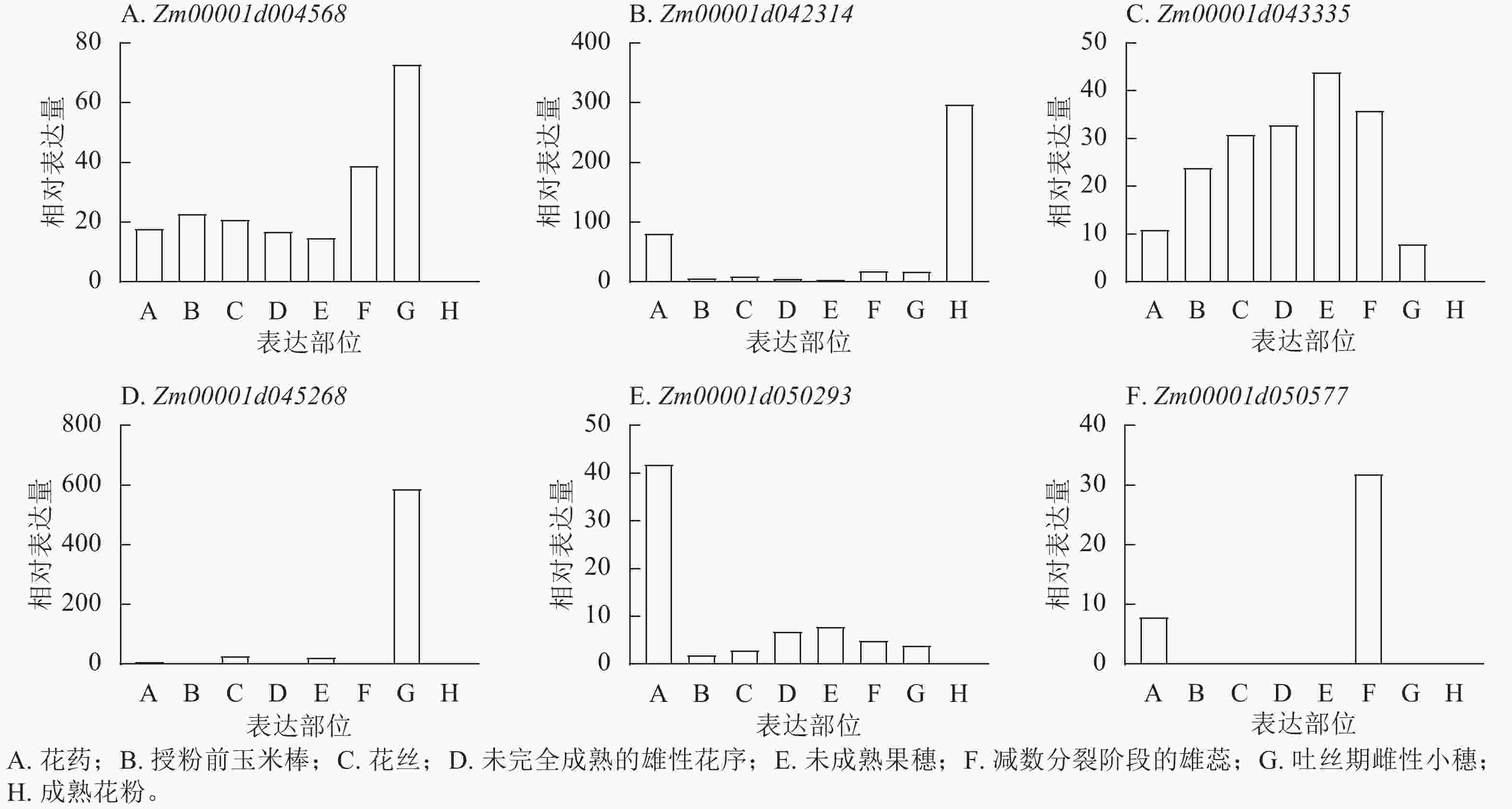 图  8  玉米生育期候选基因在不同组织部位的相对表达谱分析