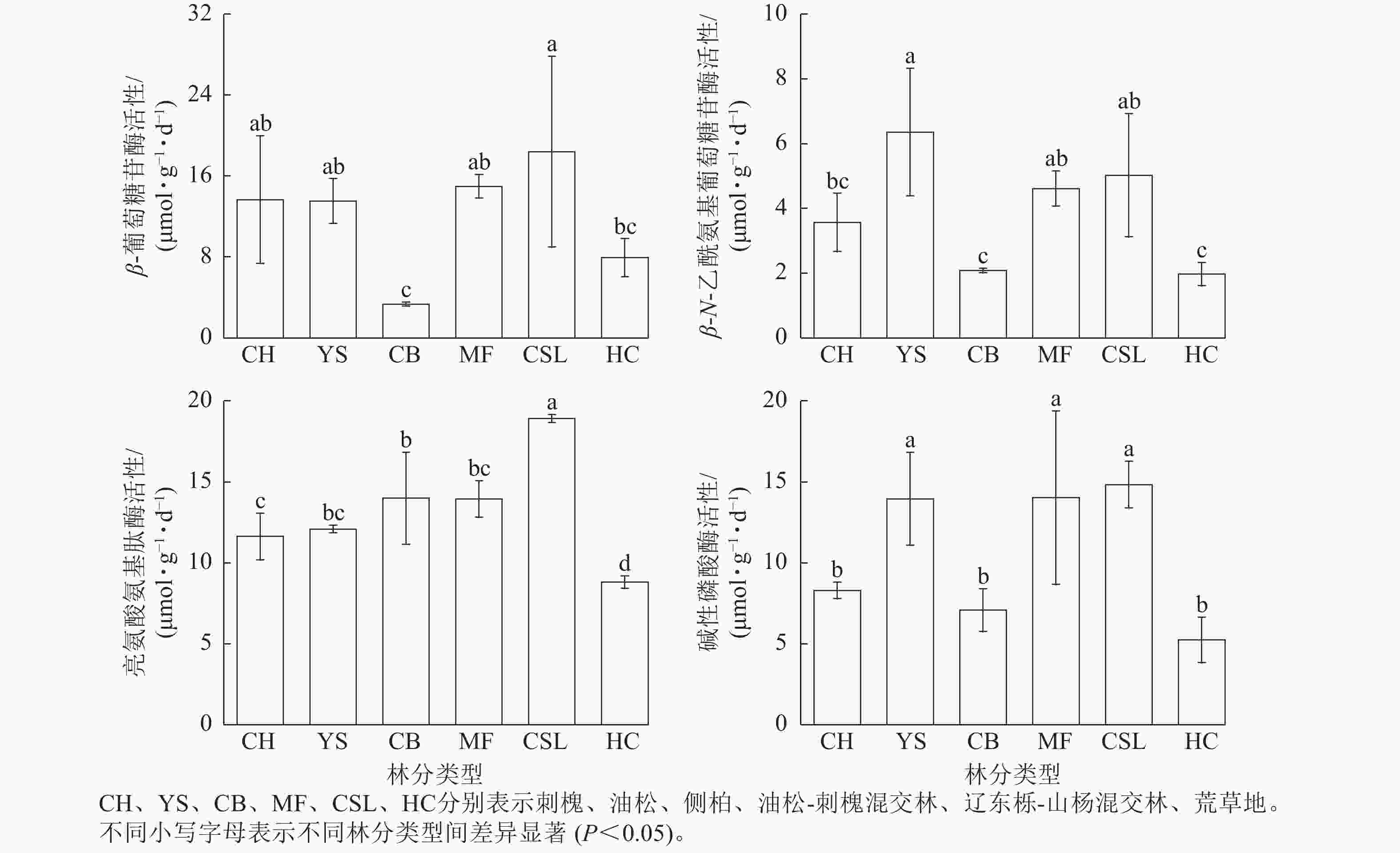 • 图1表明:土壤β-葡萄糖苷酶、亮氨酸氨基肽酶、碱性磷酸酶活性在辽东栎-山杨天然混交林中最高,分别为18.41、18.92、14.84 μmol·g−1·d−1,分别为荒草地的2.23、2.15、2.83倍。土壤β-N-乙酰氨基葡萄糖苷酶活性在油松纯林中最高,为6.36 μmol·g−1·d−1,是荒草地的3.23倍。侧柏纯林的土壤β-葡萄糖苷酶活性低于荒草地,仅为荒草地的40%。除了油松纯林的土壤β-N-乙酰氨基葡萄糖苷酶活性和荒草地的土壤β-葡萄糖苷酶活性外,土壤β-葡萄糖苷酶、β-N-乙酰氨基葡萄糖苷酶、亮氨酸氨基肽酶、碱性磷酸酶活性在不同林分类型间表现出相似的规律性,从大到小依次为混交林、纯林、荒草地。