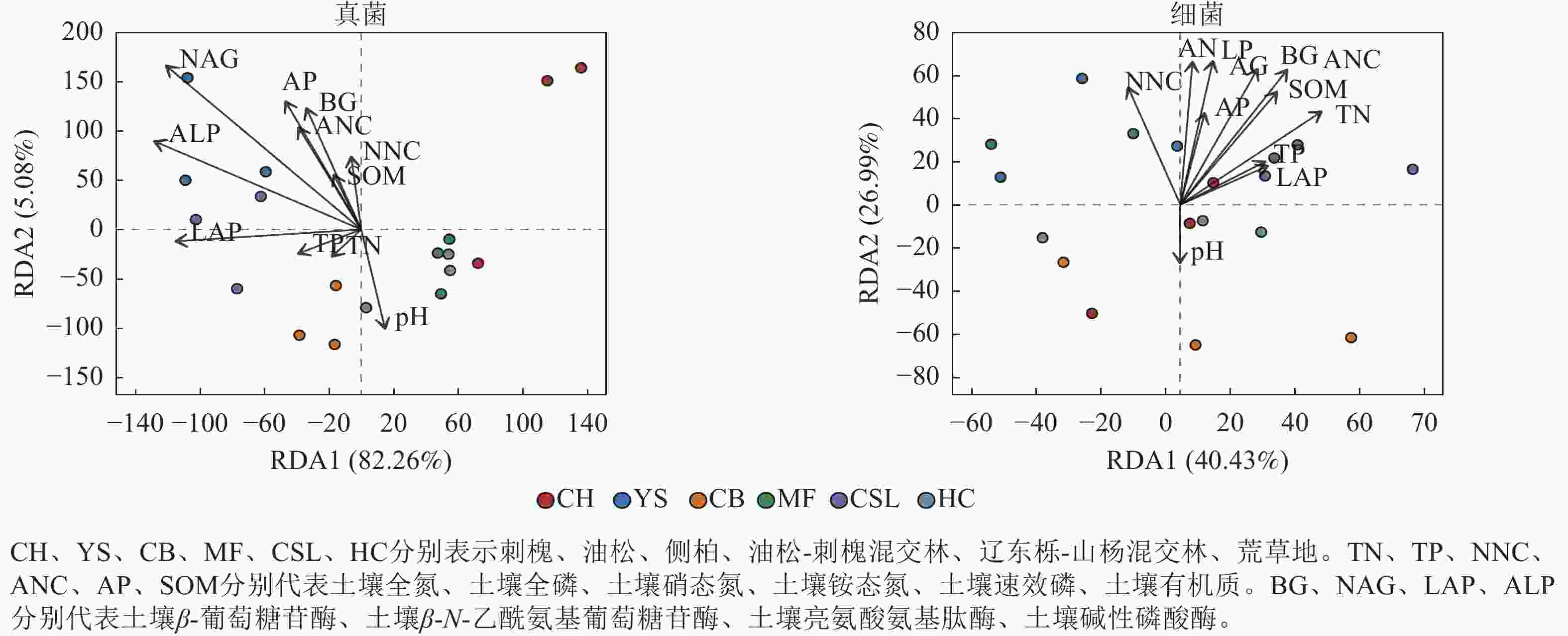 说明:CH、YS、CB、MF、CSL、HC分别表示刺槐、油松、侧柏、油松-刺槐混交林、辽东栎-山杨混交林、荒草地。