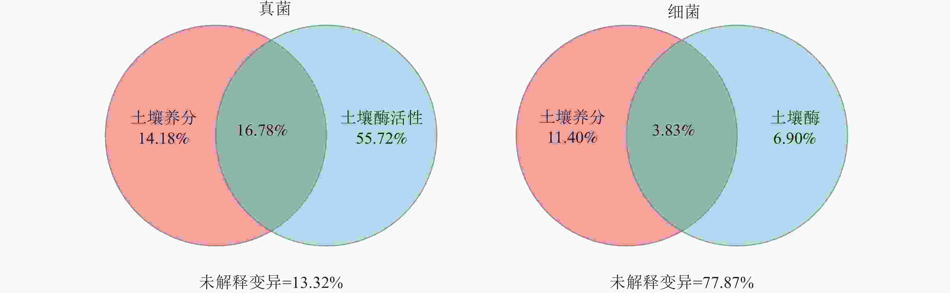 方差分解分析表明:土壤酶活性对真菌群落变化的解释度显著高于对细菌群落的解释度,这表明在黄土高原典型林地土壤中,真菌群落的结构更容易受到土壤酶活性的驱动[32]。此外,土壤养分和酶活性对真菌群落的联合解释度明显高于对细菌群落的联合解释度,该结果进一步表明真菌群落受到土壤养分含量和酶活性的共同调控[10]