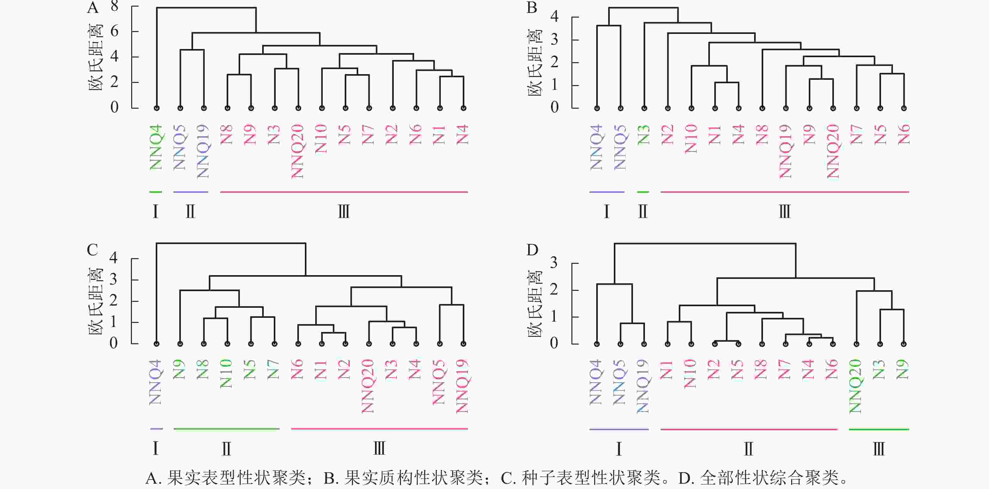 • 在果实表型特征维度考察中,发现色度与品质关联较弱,因此未将其纳入聚类分析体系。对14个品种分别从果实表型(除色度外)、果实质构特征及种子表型特征3个维度进行系统分析,并基于所有性状指标开展综合评价(图3)。基于果实性状聚类分析结果(图3A)显示:‘宁农杞4号’与‘宁农杞5号’聚为第Ⅰ类群,两者果实显著小于其他品种。‘宁杞3号’因果柄特征突出单独成类(Ⅱ类群),其余11个品种构成Ⅲ类群。基于果实质构性状聚类分析结果(图3B)显示:‘宁农杞4号’因独特机械特性独立成类(Ⅰ类群),其硬度最高,但弹性最低,黏着性与胶着性高于其他品种,建议采用低温干燥工艺保留色泽。‘宁杞5号’ ‘宁杞7号’等5个低黏着性品种聚为Ⅱ类群。余下8个高咀嚼性品种构成Ⅲ类群。基于种子性状聚类分析结果(图3C)显示:‘宁农杞4号’ ‘宁农杞5号’ ‘宁农杞19号’因近圆形种子形成Ⅰ类群;‘宁杞1号’等8个小粒品种为Ⅱ类群;‘宁农杞20号’‘宁杞3号’等大粒品种构成Ⅲ类群。整合三维度性状的综合聚类分析结果(图3D)显示:‘宁农杞4号’独立为Ⅰ类群;‘宁农杞5号’与‘宁农杞19号’聚为Ⅱ类群;其余11个品种构成Ⅲ类群。