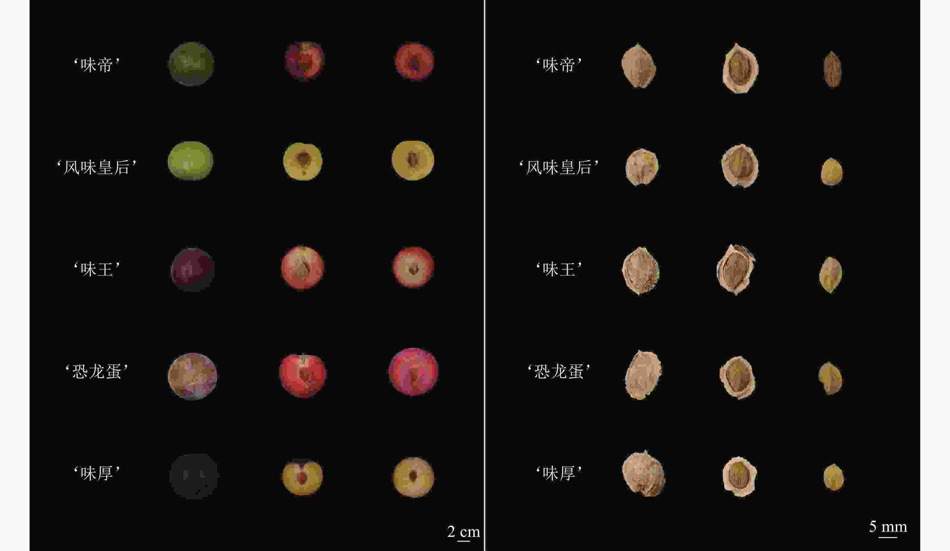 由图1和表1可知:果形多数为扁圆形、圆形,‘味王’为卵圆形。果顶形状以凹入为主,‘味王’为圆凸,‘恐龙蛋’为平,‘味厚’为尖圆。梗洼深度以深为主,‘味帝’为中,‘风味皇后’为浅;梗洼广狭以广为主,‘风味皇后’为狭,‘恐龙蛋’为中。5个品种果实对称性以对称为主,果实整齐度较好。除‘味王’外,其他品种果粉均薄。多数品种果面大部分着色,果皮底色以绿黄为主,果皮彩色差异较大分为紫黑、橙黄、紫红3种,果肉色泽以紫红、橙黄、紫红为主。果核核黏离程度分为黏核、半离核、离核3种;核形以卵圆形为主,其次为圆形;核面以平滑、较平滑为主,‘味王’表现为粗糙。果皮剥离难易程度均表现为难剥离。