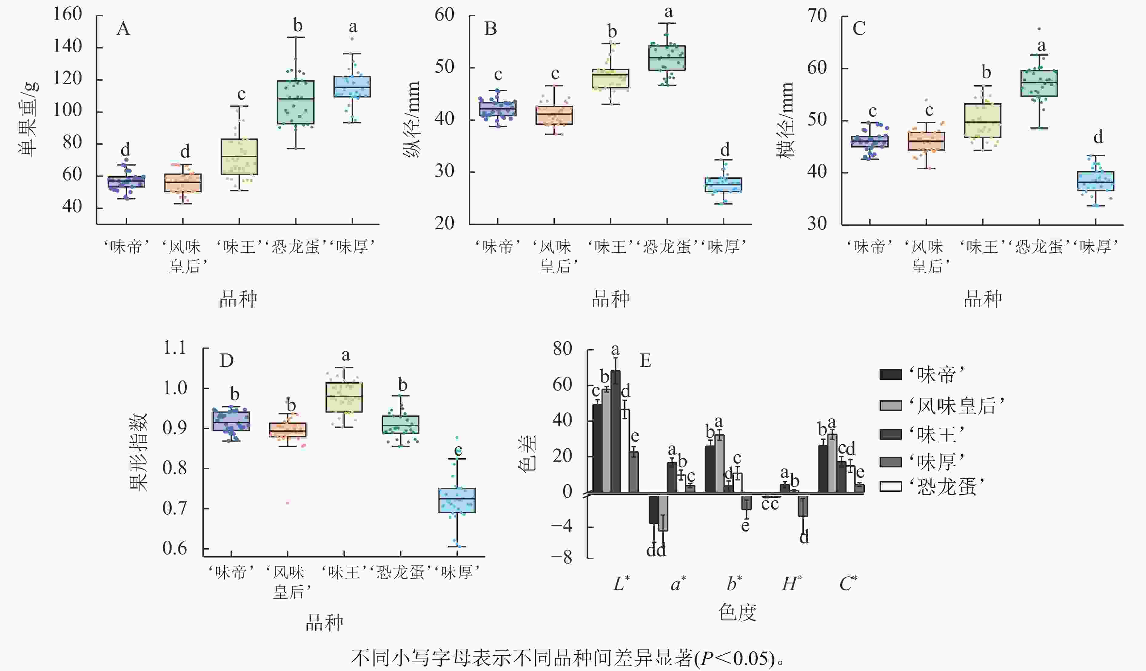由图2A可知:‘味厚’的单果质量分数显著高于其他品种(P<0.05),单果质量为115.23 g。由图2B和2C可知:‘恐龙蛋’的果实纵横径最大,分别为51.94、57.31 mm,均显著高于其他品种(P<0.05)。由图2D可知,‘味王’的果形指数显著高于其他品种(P<0.05),其分别高出7.14%、9.18%、7.14%和25.51%。由图2E可知,在果皮亮度值中,‘味王’的L*显著高于其他品种(P<0.05),达到68.23,亮度最高,‘味厚’最低,为38.19;红色饱和度方面,‘味王’的a*为正,值最高,为16.68,色调偏红,‘味帝’和‘风味皇后’的a*为负,色调偏绿;黄色饱和度方面,‘风味皇后’的b*较高,色调相对偏黄,‘味厚’的b*为负,色调偏蓝;‘味王’的果皮H°显著大于其他品种(P<0.05);‘风味皇后’的C*显著大于其他品种(P<0.05),果皮颜色较纯。