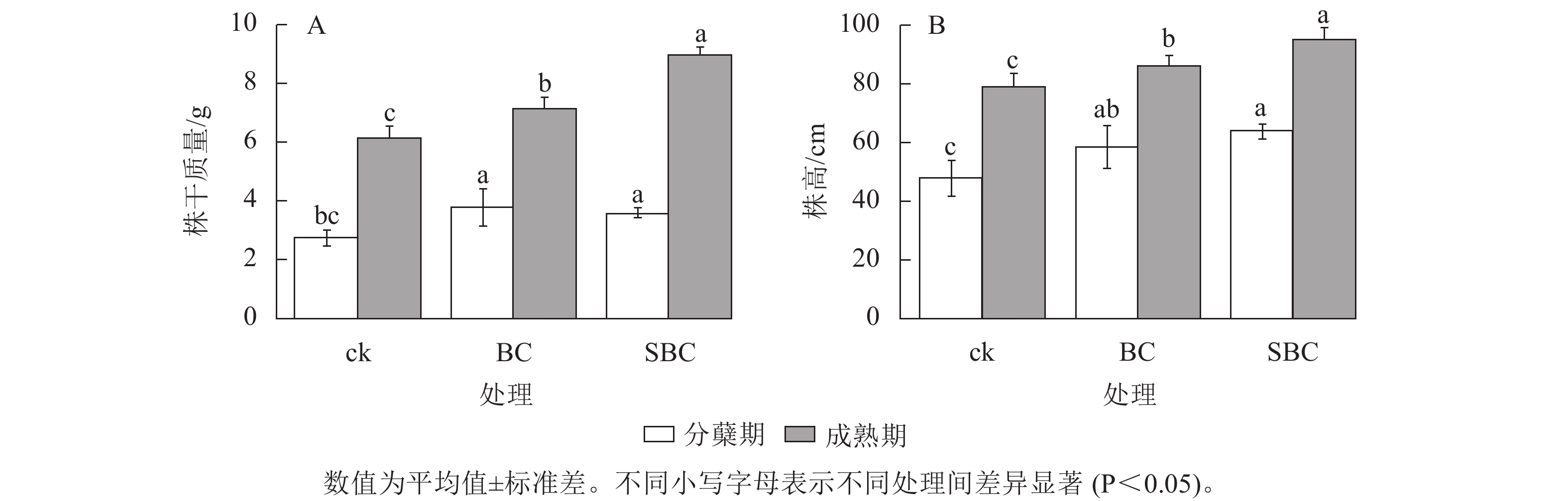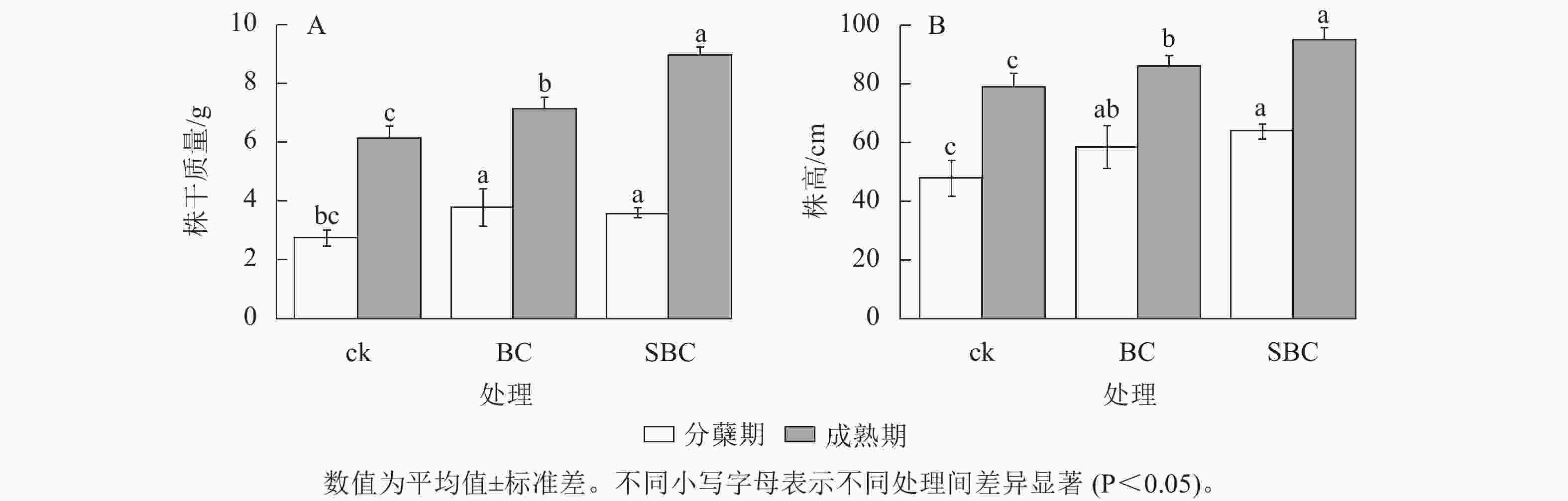 如图1所示:BC、SBC处理显著提升了水稻生物量积累(P<0.05)。水稻株干质量分蘖期较对照分别增加37.3%和26.7%,成熟期增幅达16.6%和46.7%。水稻株高生长响应呈现剂量效应,SBC处理在分蘖期和成熟期分别提高11.9%和25.0%,显著优于BC处理(P<0.05)。