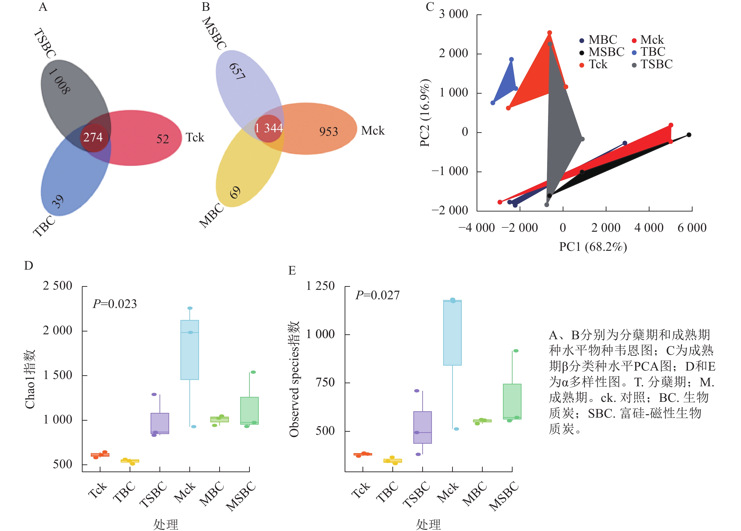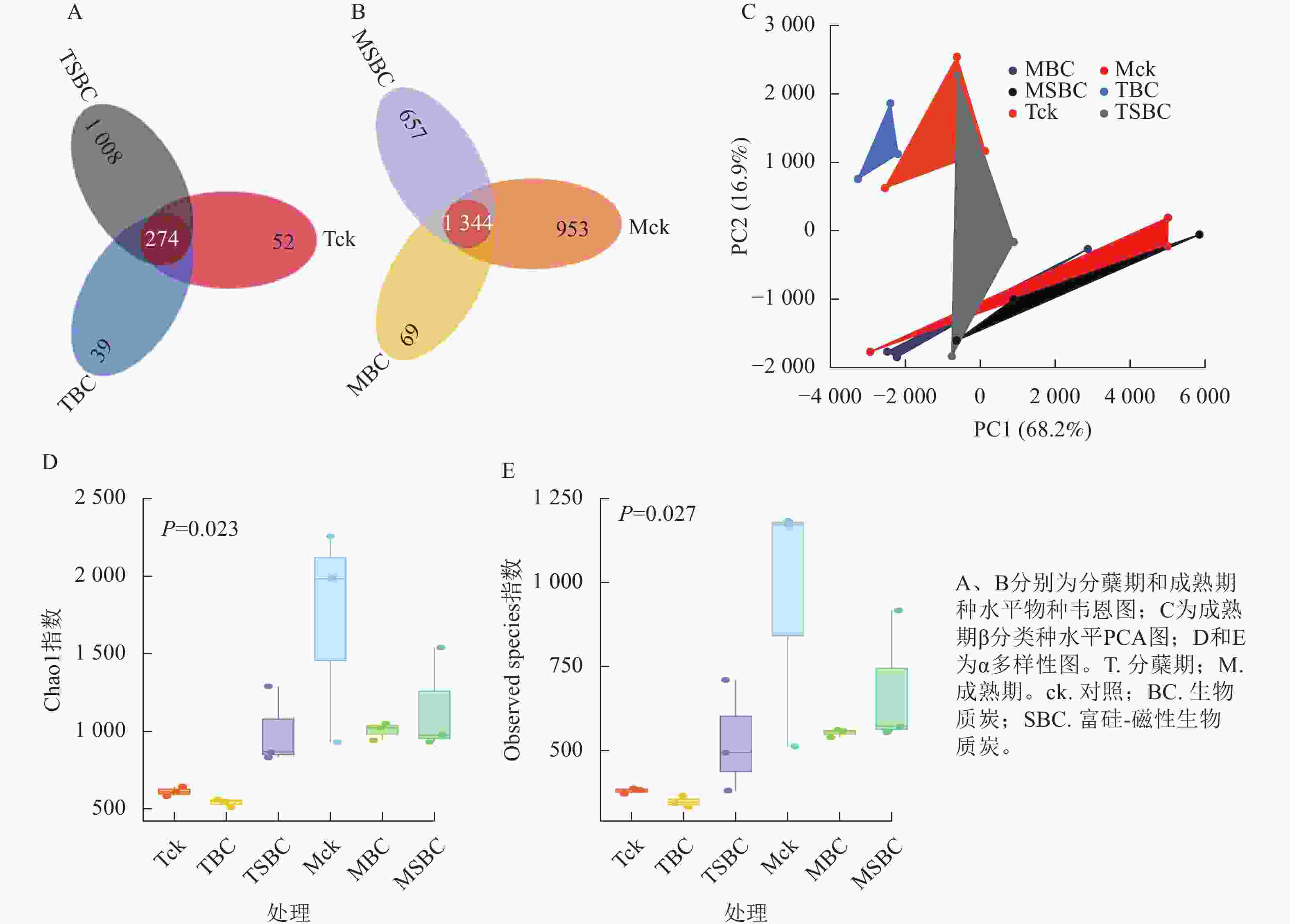 与ck相比,SBC添加提高了水稻分蘖期叶际微生物的数量和多样性,增加了群落中微生物间的相互联系与相互作用,使微生物的群落结构更加丰富和稳定。种水平韦恩图(图2A和图2B)显示:BC处理减少了2个时期微生物种类数,而SBC处理增加分蘖期但减少成熟期种类数。PCA分析(图2C)表明:同一时期ck与BC、SBC处理间群落结构差异明显,且分蘖期与成熟期差异更为突出。α多样性指数(图2D和E)进一步揭示:与ck相比,SBC显著提高了水稻分蘖期α多样性(Chao1和Observed species)指数(P<0.05),而BC与SBC处理均降低了水稻成熟期多样性(P<0.05)。