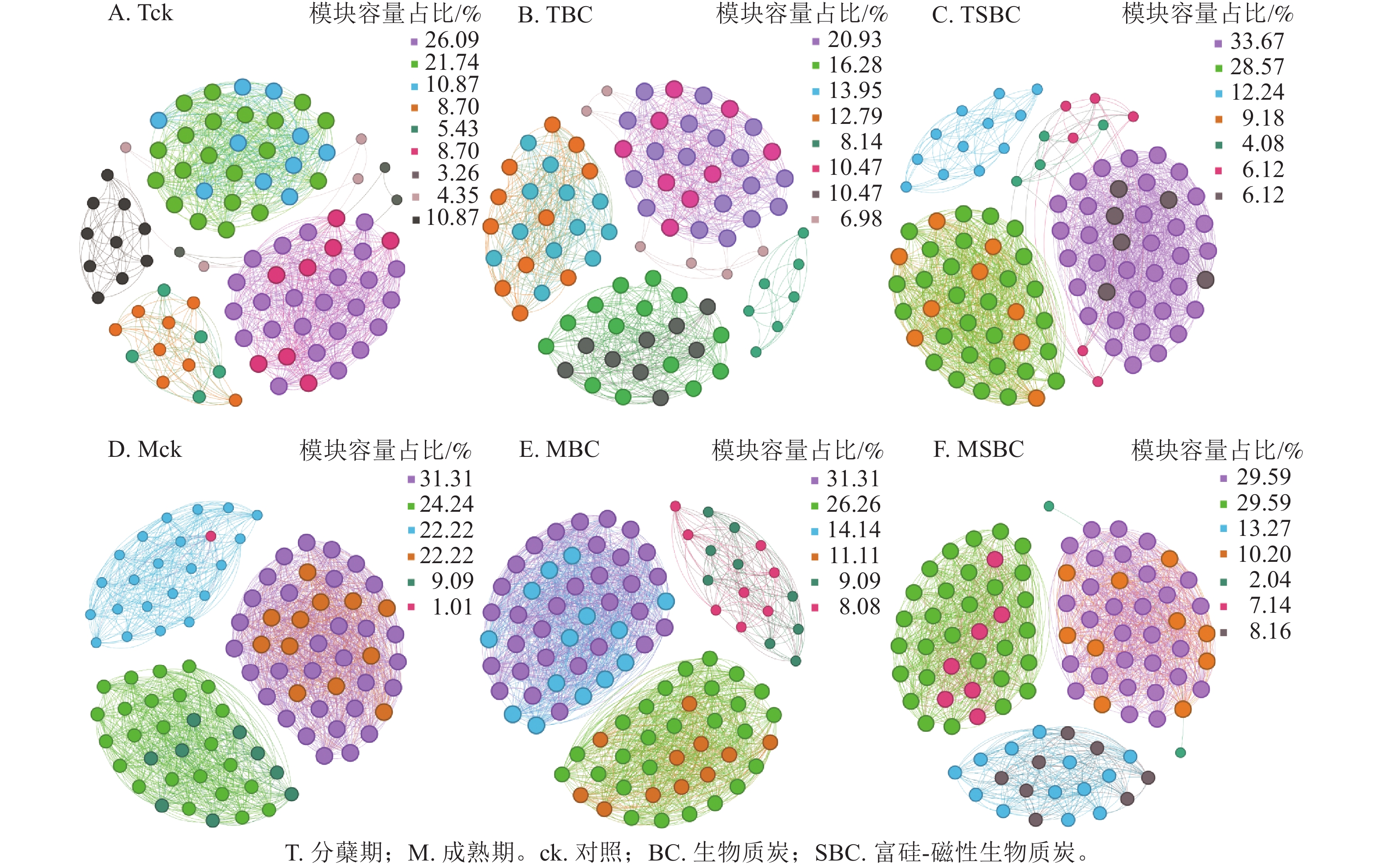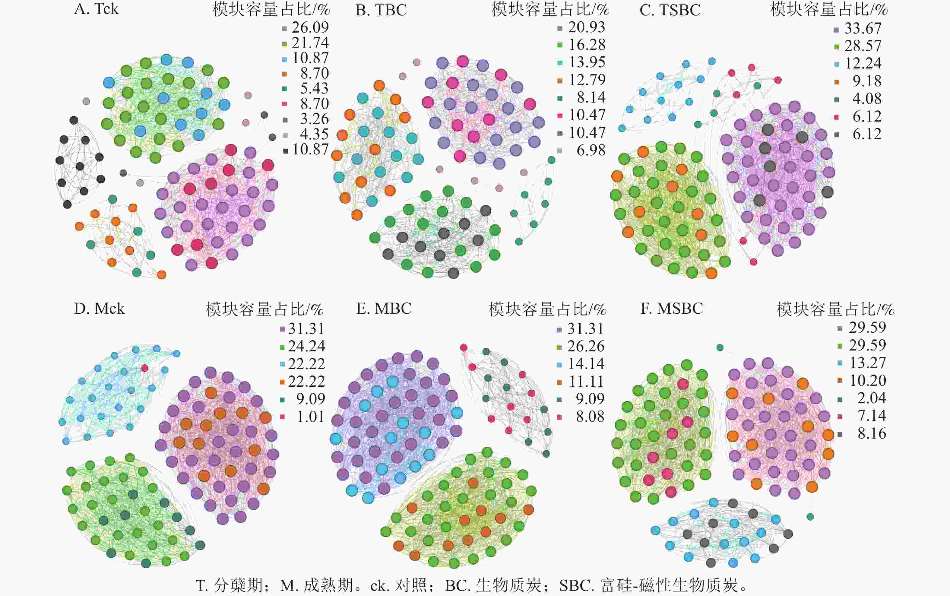 基于Spearman秩相关分析构建的共生网络(图3)显示:不同处理显著重塑了叶际微生物的互作模式(P<0.05)。整体网络呈现聚集性,划分为6~9个主要模块。在分蘖期,材料添加降低了网络模块化程度。ck处理包含9个模块,而BC与SBC处理分别降至8和7个。成熟期SBC处理的模块数增至7个,显著高于BC与ck。拓扑结构分析表明:分蘖期SBC处理组的边数、平均加权度及图密度均高于ck和BC,表明SBC促使叶际微生物群落稳定性增强。