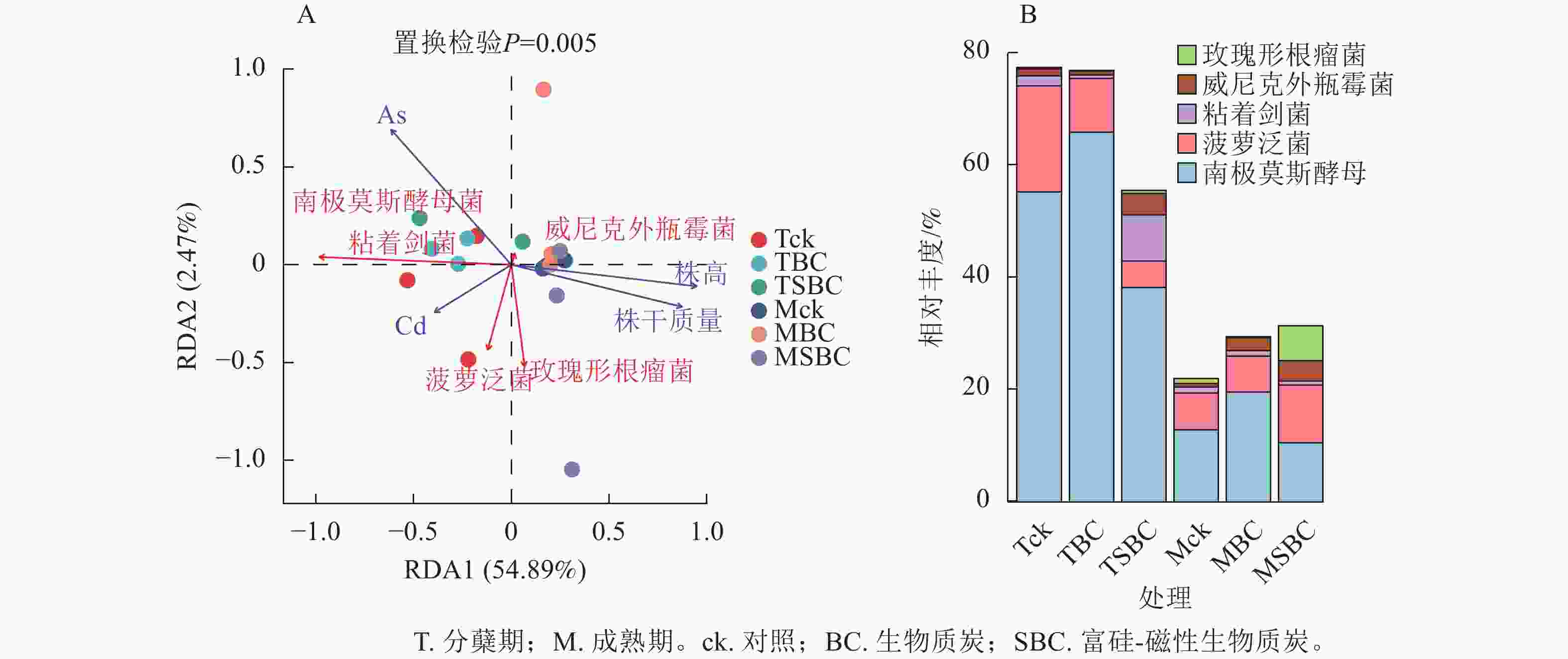 图 4 微生物与环境因子的RDA分析(A)和关键微生物的相对丰度图(B)