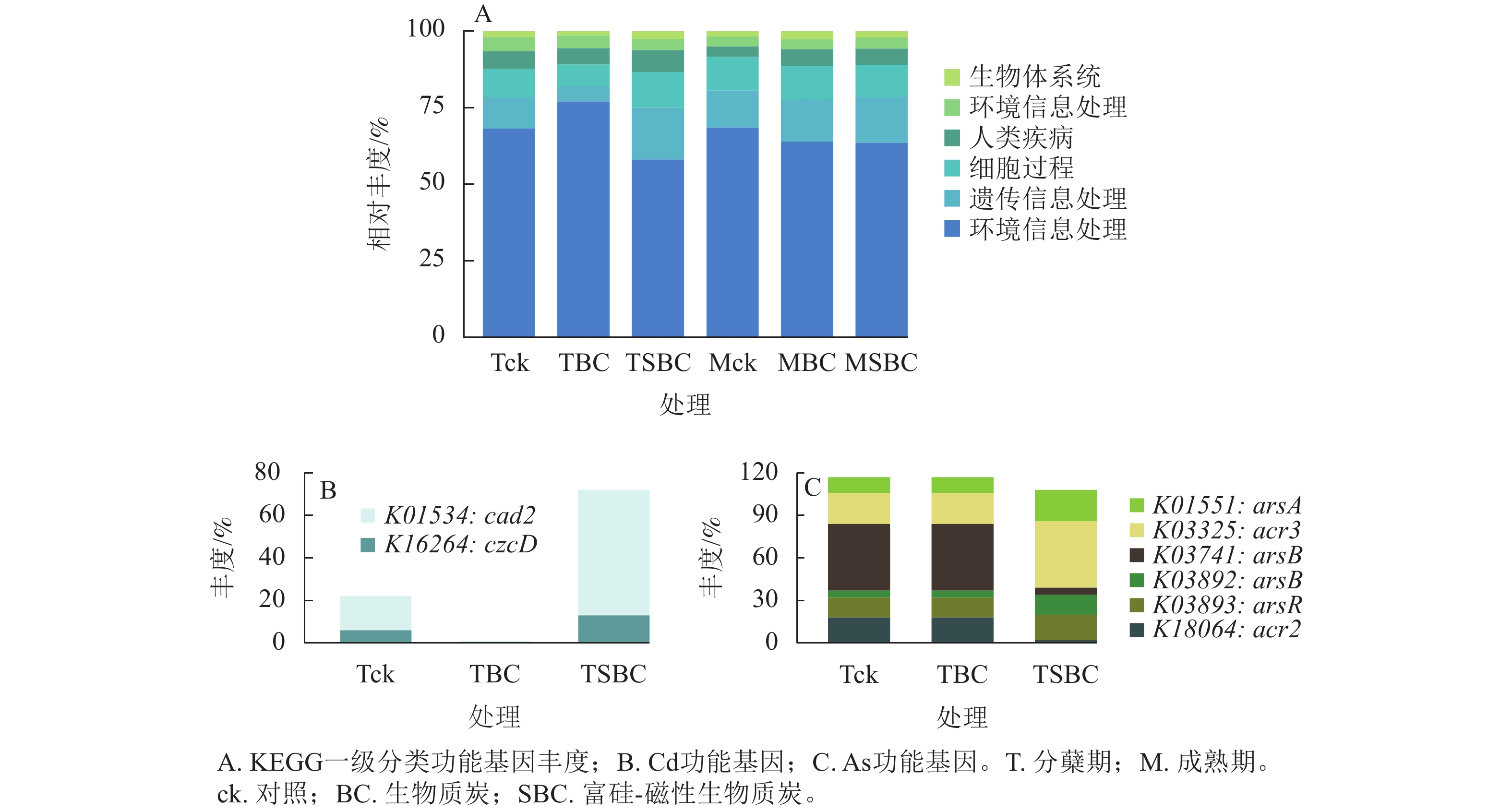 SBC的添加通过重塑叶际微生物的代谢功能配置与基因表达模式,增强了群落对重金属胁迫的适应能力。在宏观代谢功能层面,SBC改变了微生物群落的资源分配策略。新陈代谢、遗传信息处理及细胞过程是决定微生物适应性的核心要素。在Cd、As胁迫下,微生物通常被迫优先分配资源维持基础新陈代谢以求生存[41]。然而,添加SBC后,叶际微生物的新陈代谢功能丰度显著降低,而遗传信息处理和细胞过程的丰度则相应升高。这种代谢重定向归因于SBC优异的理化性质:其磁性改性与富硅组分在材料表面形成A型与B型三元表面络合物,大幅增强了对Cd和As的吸附效率[6]。这种高效吸附降低了环境毒性,缓解了微生物的代谢压力,使其能将能量用于优化遗传信息传递与细胞生理活动[42]。相比之下,BC吸附能力较弱,导致微生物仍需维持高代谢水平以应对胁迫[43]。这种由材料特性驱动的功能优化提升了群落的功能冗余度,增强了土壤-水稻系统在环境扰动下的稳定性。